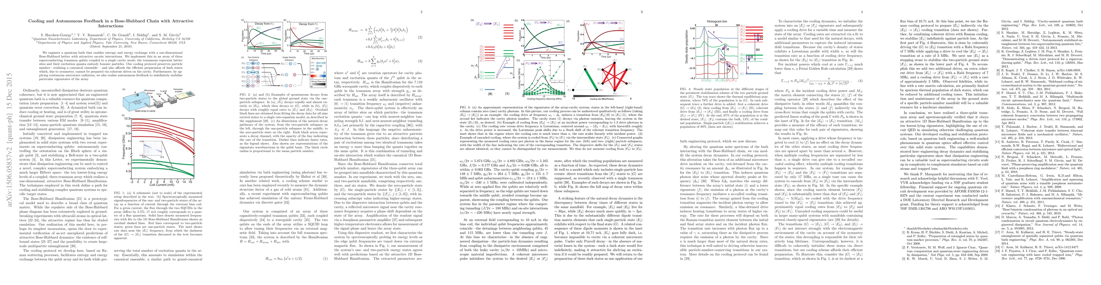 This paper details a quantum bath setup for a Bose-Hubbard chain with attractive interactions, implemented using superconducting qubits and a cavity mode. The cooling protocol preserves particle number and enables the preparation of dark states, while autonomous feedback stabilizes specific eigenstates.