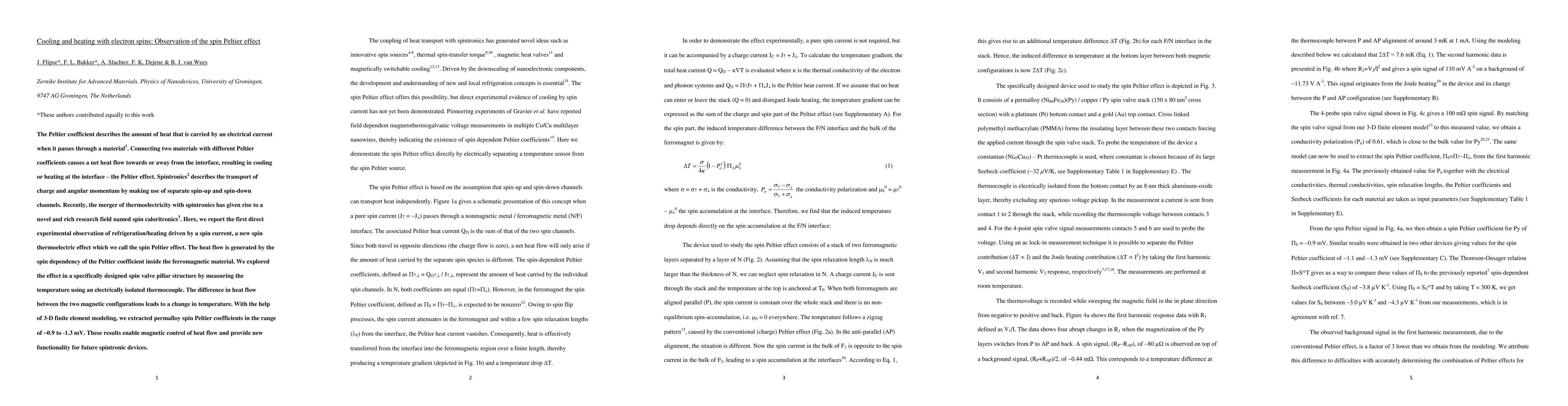 This paper reports the first direct observation of the spin Peltier effect, a new thermoelectric phenomenon where a spin current induces refrigeration or heating in a ferromagnetic material. The study demonstrates magnetic control of heat flow and provides spin Peltier coefficients for permalloy, enabling potential advancements in spintronic devices.