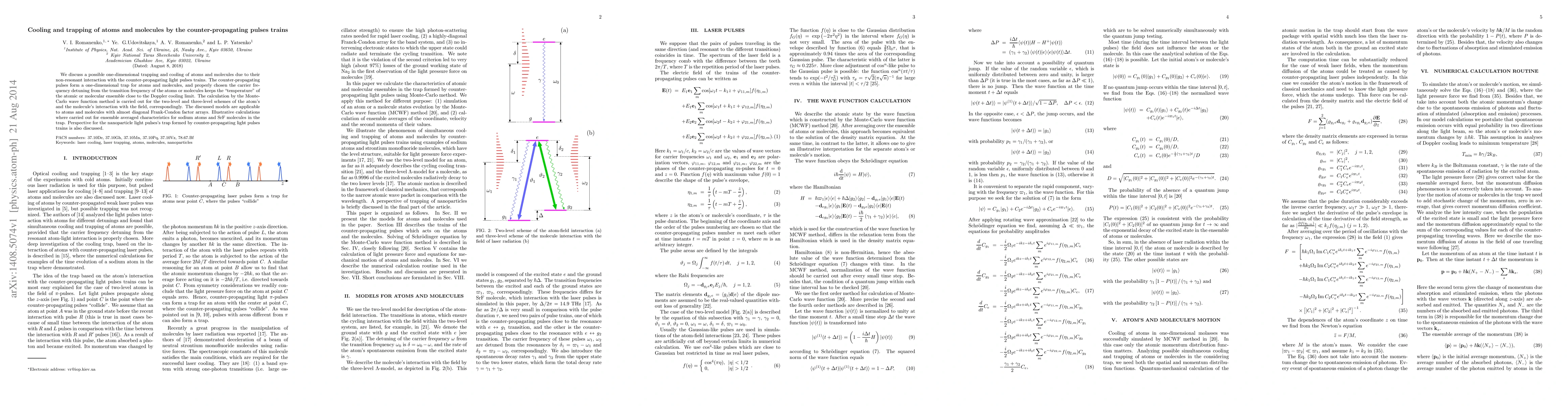 The paper presents a detailed theoretical framework for trapping and cooling atoms and molecules using counter-propagating light pulses, incorporating quantum jump testing and light pressure force calculations.