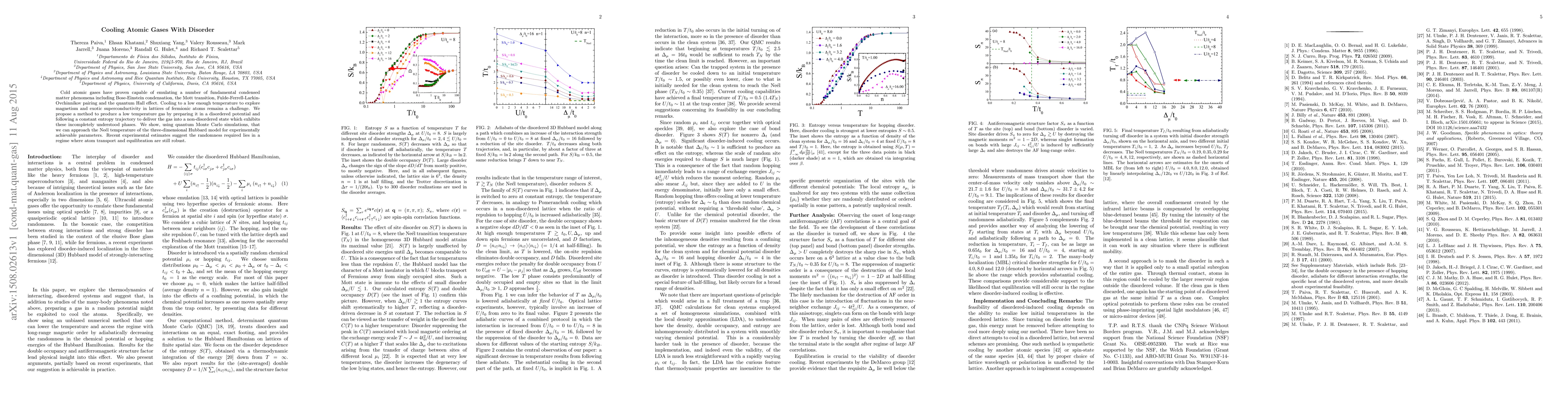 This research proposes a method to cool atomic gases using disorder, enabling exploration of exotic phases like magnetism and superconductivity. Quantum Monte Carlo simulations show approaching the Neel temperature of the 3D Hubbard model is possible with experimentally feasible parameters.