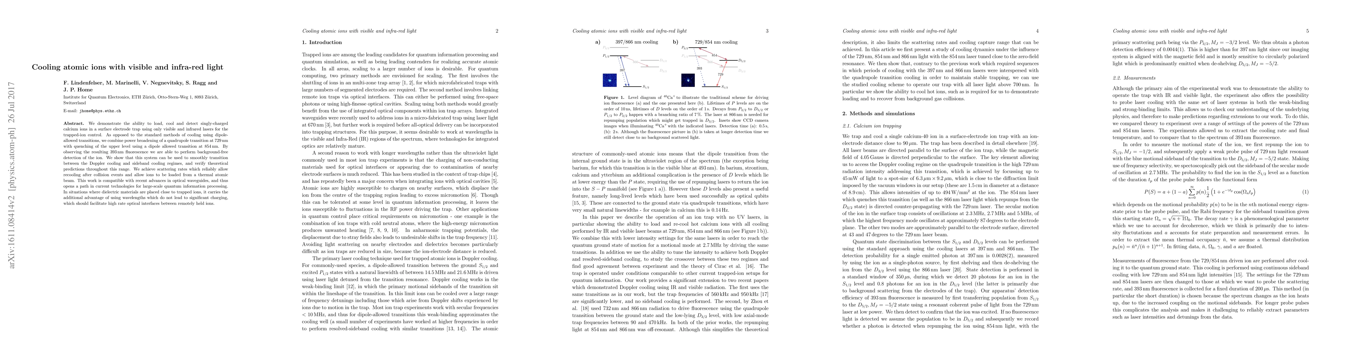 This paper demonstrates the cooling of singly-charged calcium ions using only visible and infrared lasers, combining power broadening and quenching techniques to achieve efficient cooling and background-free detection. The method allows for smooth transitions between cooling regimes and supports large-scale quantum information processing.
