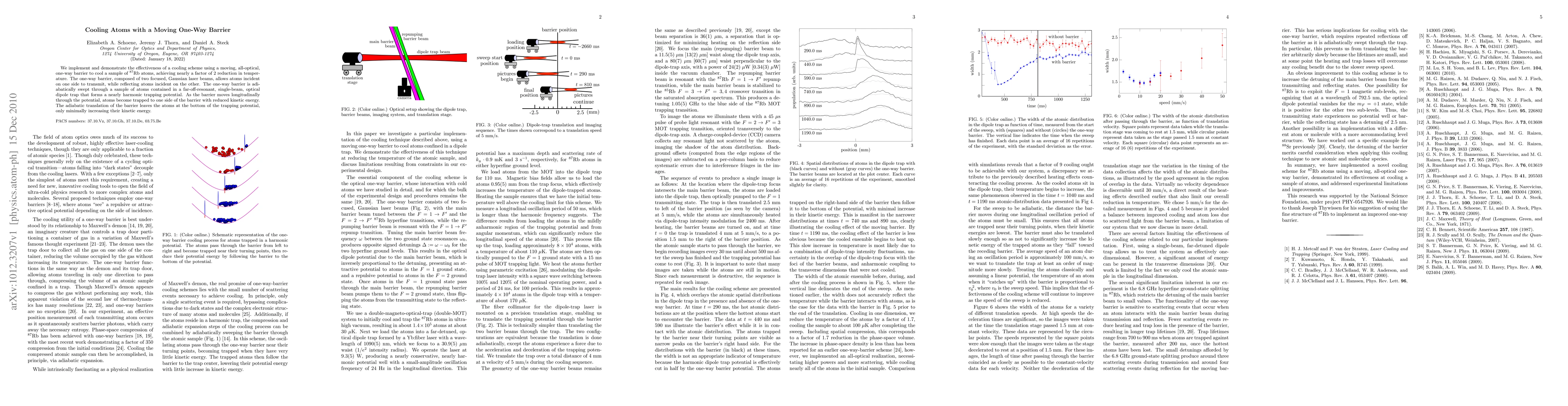 We implement and demonstrate the effectiveness of a cooling scheme using a moving, all-optical, one-way barrier to cool a sample of $^{87}$Rb atoms, achieving nearly a factor of 2 reduction in temperature. The one-way barrier, composed of two focused, Gaussian laser beams, allows atoms incident on one side to transmit, while reflecting atoms incident on the other. The one-way barrier is adiabatically swept through a sample of atoms contained in a far-off-resonant, single-beam, optical dipole trap that forms a nearly harmonic trapping potential. As the barrier moves longitudinally through the potential, atoms become trapped to one side of the barrier with reduced kinetic energy. The adiabatic translation of the barrier leaves the atoms at the bottom of the trapping potential, only minimally increasing their kinetic energy.