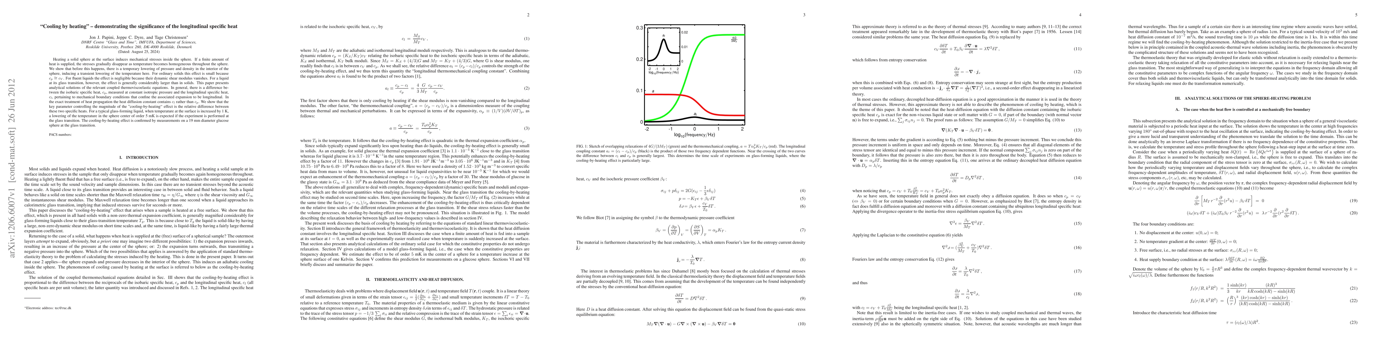 Heating a solid sphere at the surface induces mechanical stresses inside the sphere. If a finite amount of heat is supplied, the stresses gradually disappear as temperature becomes homogeneous throughout the sphere. We show that before this happens, there is a temporary lowering of pressure and density in the interior of the sphere, inducing a transient lowering of the temperature here. For ordinary solids this effect is small because c_p is almost equal to c_V. For fluent liquids the effect is negligible because their dynamic shear modulus vanishes. For a liquid at its glass transition, however, the effect is generally considerably larger than in solids. This paper presents analytical solutions of the relevant coupled thermoviscoelastic equations. In general, there is a difference between the isobaric specific heat, c_p, measured at constant isotropic pressure and the longitudinal specific heat, c_l, pertaining to mechanical boundary conditions that confine the associated expansion to be longitudinal. In the exact treatment of heat propagation the heat diffusion constant contains c_l rather than c_p. We show that the key parameter controlling the magnitude of the "cooling-by-heating" effect is the relative difference between these two specific heats. For a typical glass-forming liquid, when temperature at the surface is increased by 1 K, a lowering of the temperature in the sphere center of order 5 mK is expected if the experiment is performed at the glass transition. The cooling-by-heating effect is confirmed by measurements on a 19 mm diameter glucose sphere at the glass transition.