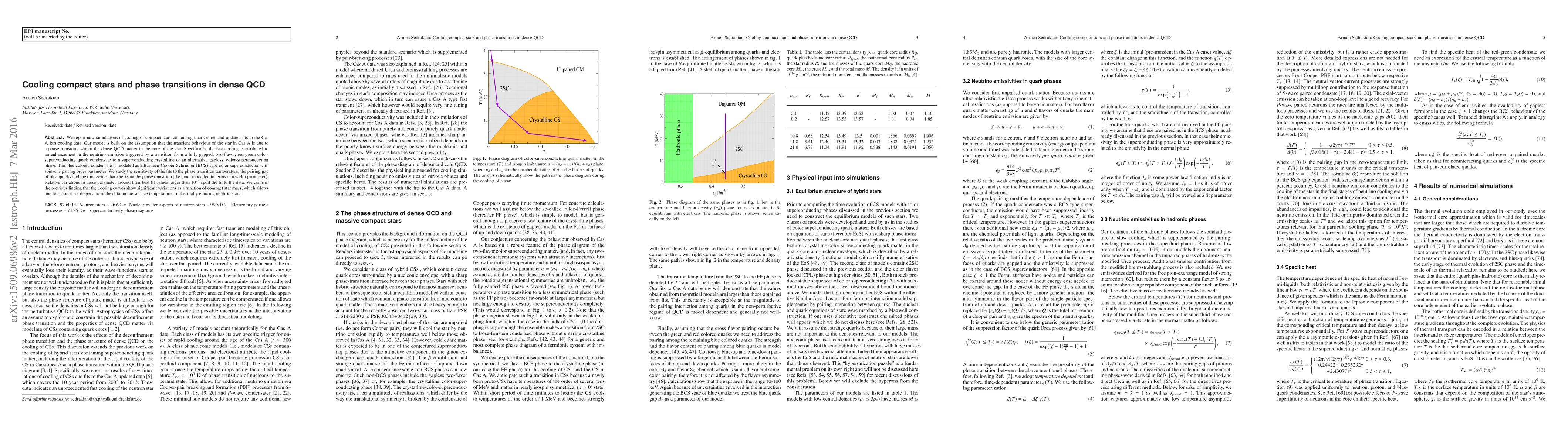 This paper presents new simulations on the cooling of compact stars with quark cores, attributing fast cooling in Cas A to a phase transition in dense QCD matter. The transition enhances neutrino emission, shifting from a fully gapped color-superconducting phase to a crystalline or gapless phase, modeled as a BCS-type superconductor.