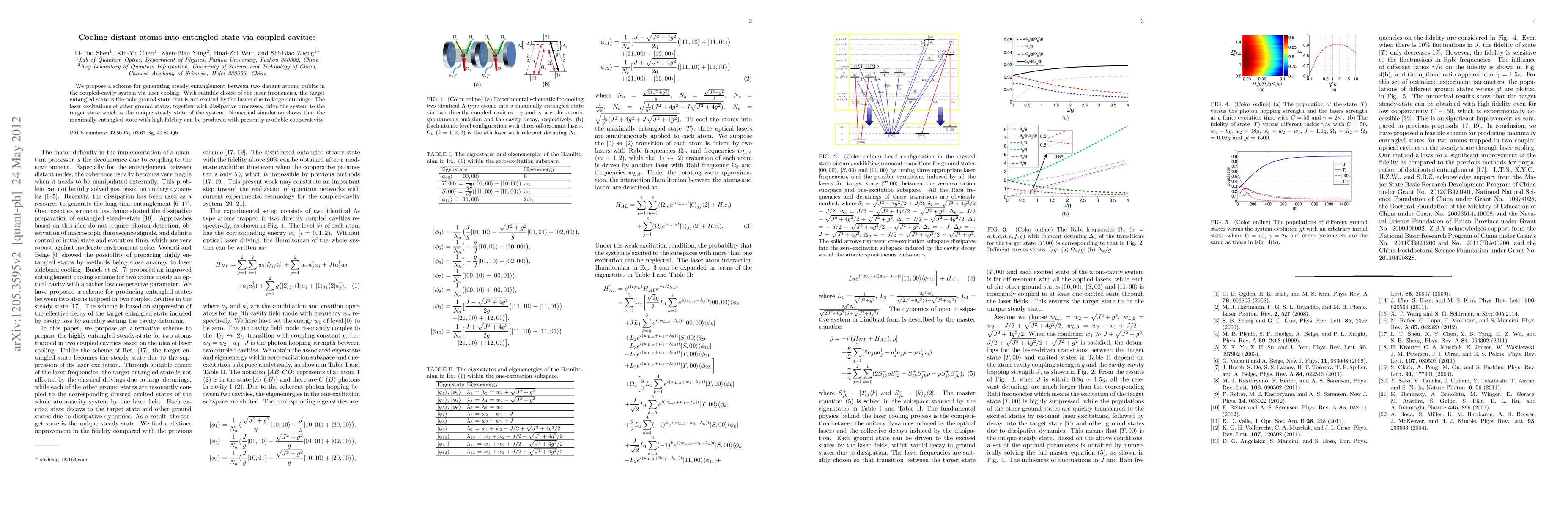 This paper proposes a method to generate steady entanglement between two distant atomic qubits using coupled cavities and laser cooling. By carefully selecting laser frequencies and exploiting detuning, the system is driven to the maximally entangled state, which becomes the unique steady state.