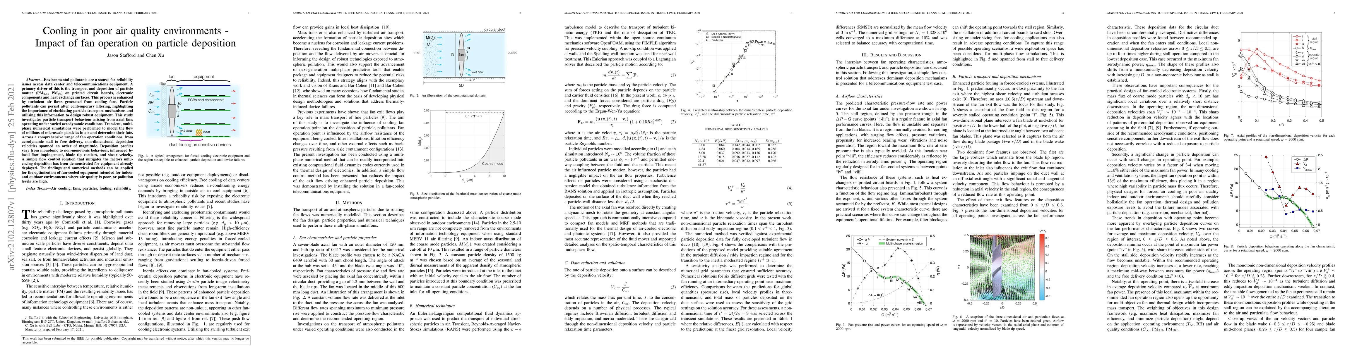 Environmental pollutants are a source for reliability issues across data center and telecommunications equipment. A primary driver of this is the transport and deposition of particle matter (PM$_{2.5}$, PM$_{10}$) on printed circuit boards, electronic components and heat exchange surfaces. This process is enhanced by turbulent air flows generated from cooling fans. Particle pollutants can persist after contemporary filtering, highlighting the importance of elucidating particle transport mechanisms and utilising this information to design robust equipment. This study investigates particle transport behaviour arising from axial fans operating under varied aerodynamic conditions. Transient, multi-phase numerical simulations were performed to model the flow of millions of microscale particles in air and determine their fate. Across a comprehensive range of fan operation conditions, from aerodynamic stall to free delivery, non-dimensional deposition velocities spanned an order of magnitude. Deposition profiles vary from monotonic to non-monotonic behaviour, influenced by local flow impingement, blade tip vortices, and shear velocity. A simple flow control solution that mitigates the factors influencing deposition has been demonstrated for equipment already deployed. The findings and numerical methods can be applied for the optimization of fan-cooled equipment intended for indoor and outdoor environments where air quality is poor, or pollution levels are high.