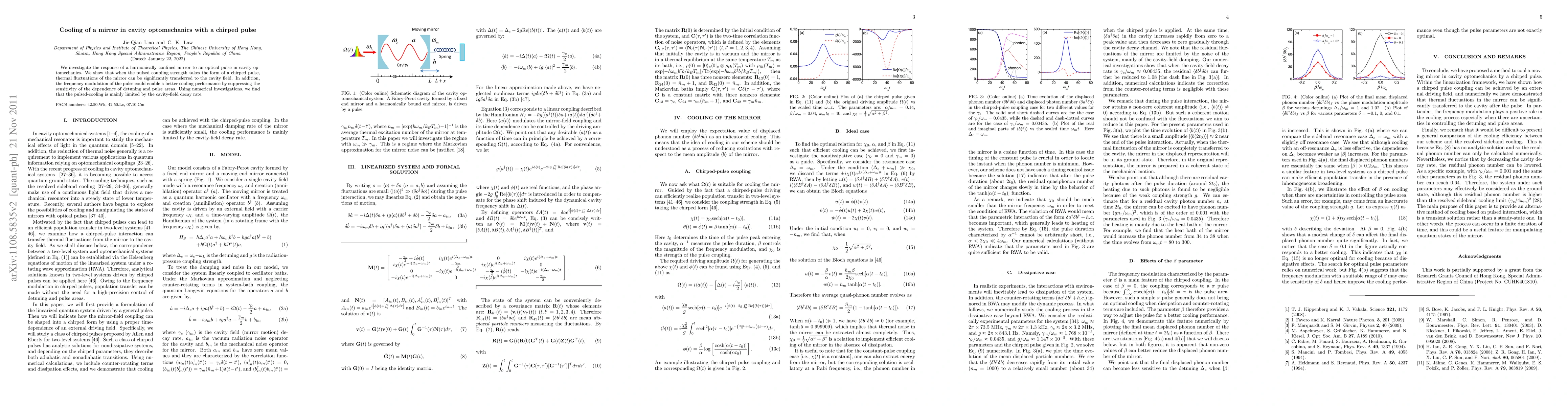 This paper explores how a chirped optical pulse affects the cooling of a harmonically confined mirror in cavity optomechanics, demonstrating that such pulses can transfer thermal fluctuations to the cavity field, potentially enhancing cooling efficiency by reducing sensitivity to detuning and pulse areas. Numerical studies reveal that the cooling performance is primarily limited by the cavity-field decay rate.