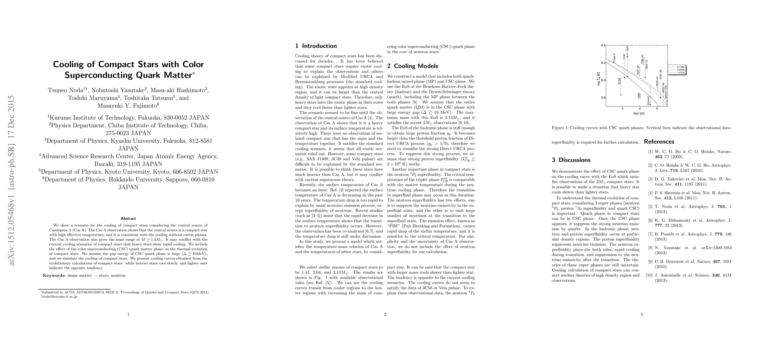 This paper explores the cooling of compact stars, particularly focusing on the effect of color superconducting quark matter in their thermal evolution. Observations of the Cas A central source suggest slow cooling consistent with no exotic phases, conflicting with rapid cooling expected for heavier stars. The study finds that heavier stars cool slowly due to the large gap energy in the CSC quark phase.