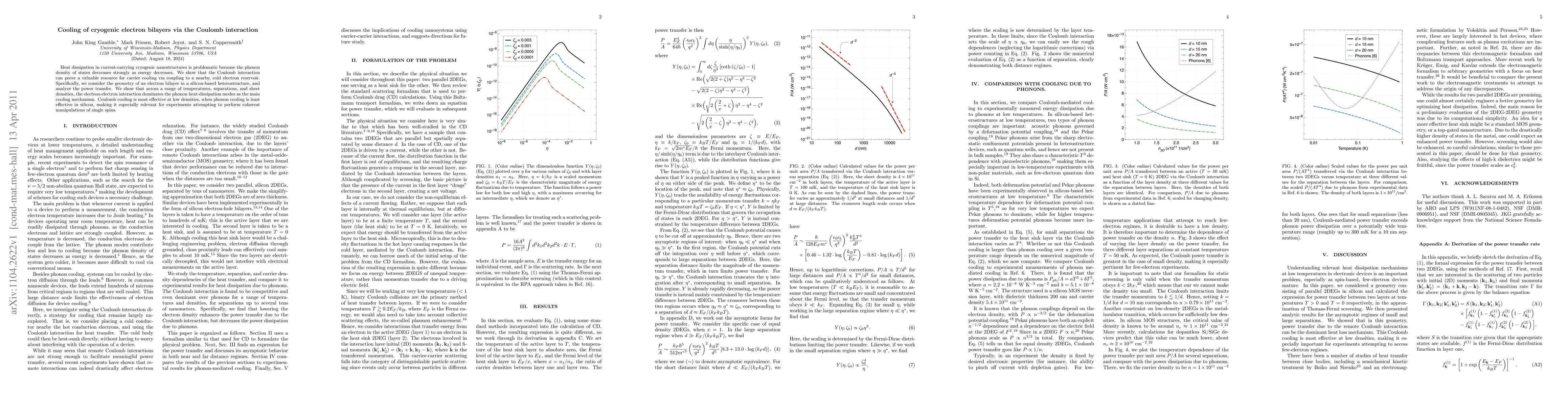 Heat dissipation in current-carrying cryogenic nanostructures is problematic because the phonon density of states decreases strongly as energy decreases. We show that the Coulomb interaction can prove a valuable resource for carrier cooling via coupling to a nearby, cold electron reservoir. Specifically, we consider the geometry of an electron bilayer in a silicon-based heterostructure, and analyze the power transfer. We show that across a range of temperatures, separations, and sheet densities, the electron-electron interaction dominates the phonon heat-dissipation modes as the main cooling mechanism. Coulomb cooling is most effective at low densities, when phonon cooling is least effective in silicon, making it especially relevant for experiments attempting to perform coherent manipulations of single spins.