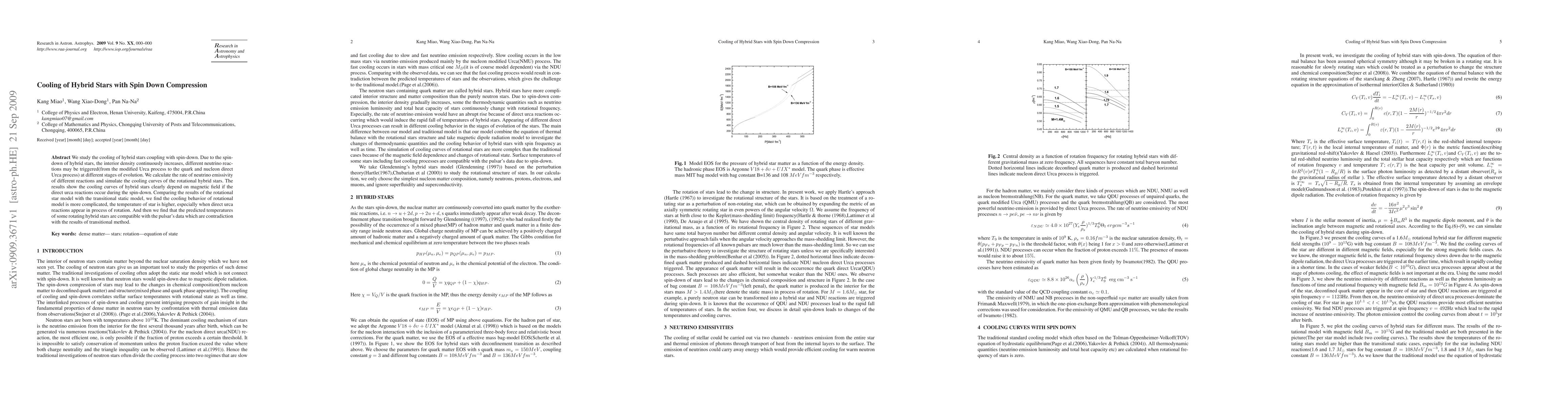 This paper investigates the cooling dynamics of hybrid stars influenced by spin-down, revealing that increased interior density triggers different neutrino reactions. The study finds that cooling curves depend on magnetic fields when direct Urca processes occur during spin-down, and rotational models predict higher temperatures, compatible with pulsar data, contradicting static models.