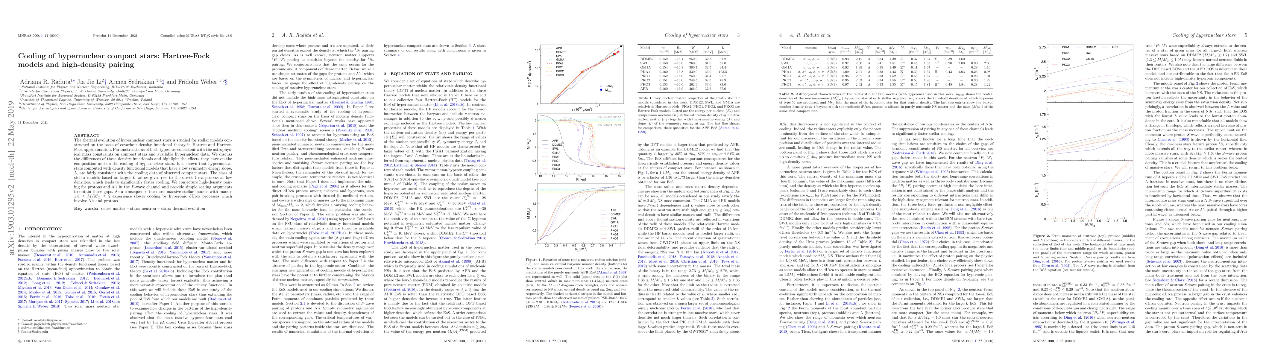 This paper investigates the thermal evolution of hypernuclear compact stars using Hartree-Fock models and high-density pairing, finding that models with lower symmetry energy slopes align better with observed cooling data. It also explores the impact of different density functionals on cooling rates and suggests high-density pairing for protons and $\Lambda$ hyperons.