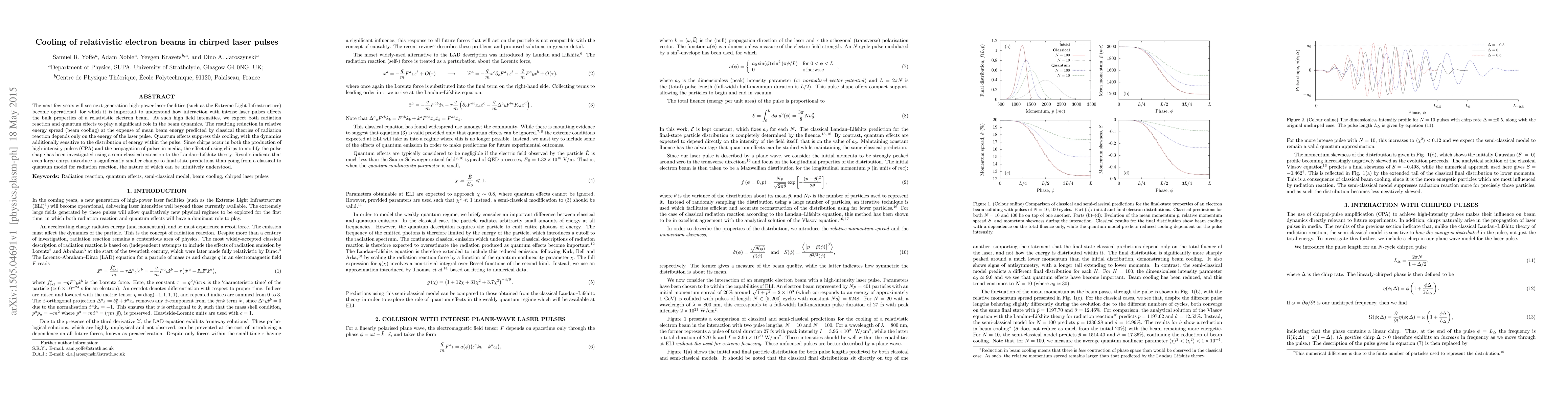 The next few years will see next-generation high-power laser facilities (such as the Extreme Light Infrastructure) become operational, for which it is important to understand how interaction with intense laser pulses affects the bulk properties of a relativistic electron beam. At such high field intensities, we expect both radiation reaction and quantum effects to play a significant role in the beam dynamics. The resulting reduction in relative energy spread (beam cooling) at the expense of mean beam energy predicted by classical theories of radiation reaction depends only on the energy of the laser pulse. Quantum effects suppress this cooling, with the dynamics additionally sensitive to the distribution of energy within the pulse. Since chirps occur in both the production of high-intensity pulses (CPA) and the propagation of pulses in media, the effect of using chirps to modify the pulse shape has been investigated using a semi-classical extension to the Landau--Lifshitz theory. Results indicate that even large chirps introduce a significantly smaller change to final state predictions than going from a classical to quantum model for radiation reaction, the nature of which can be intuitively understood.