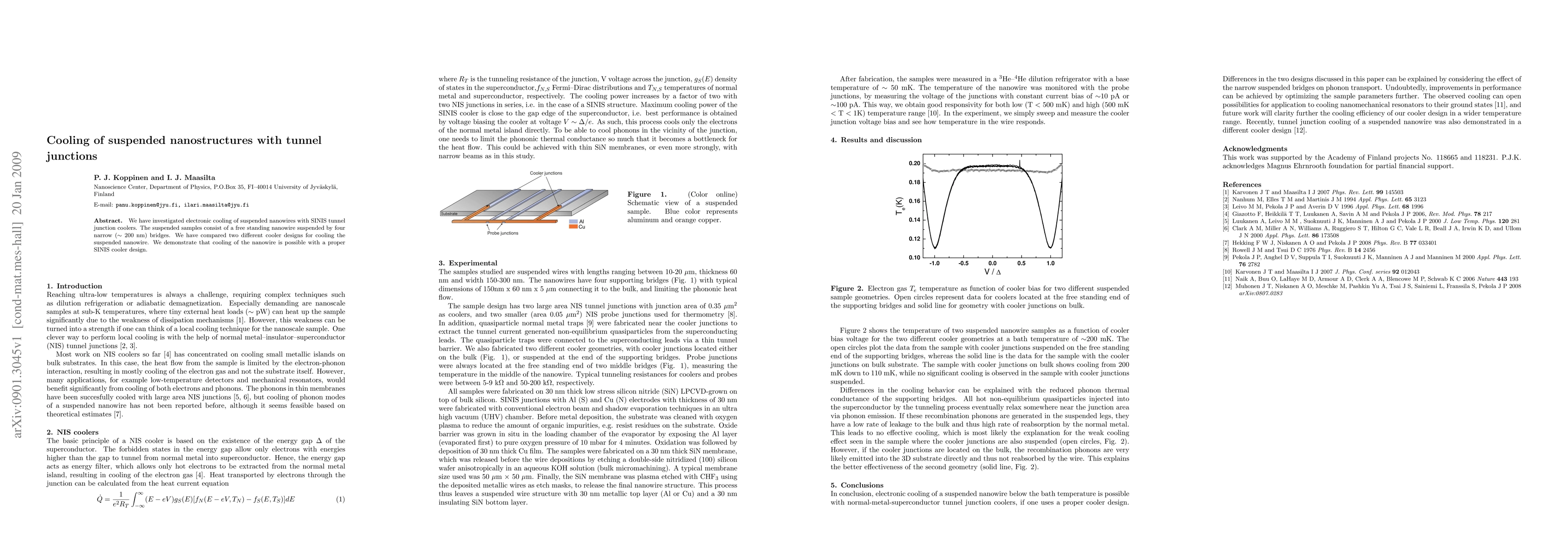 This study investigates electronic cooling of suspended nanowires using SINIS tunnel junction coolers, demonstrating that effective cooling is achievable with an appropriately designed cooler, comparing two different cooler designs.