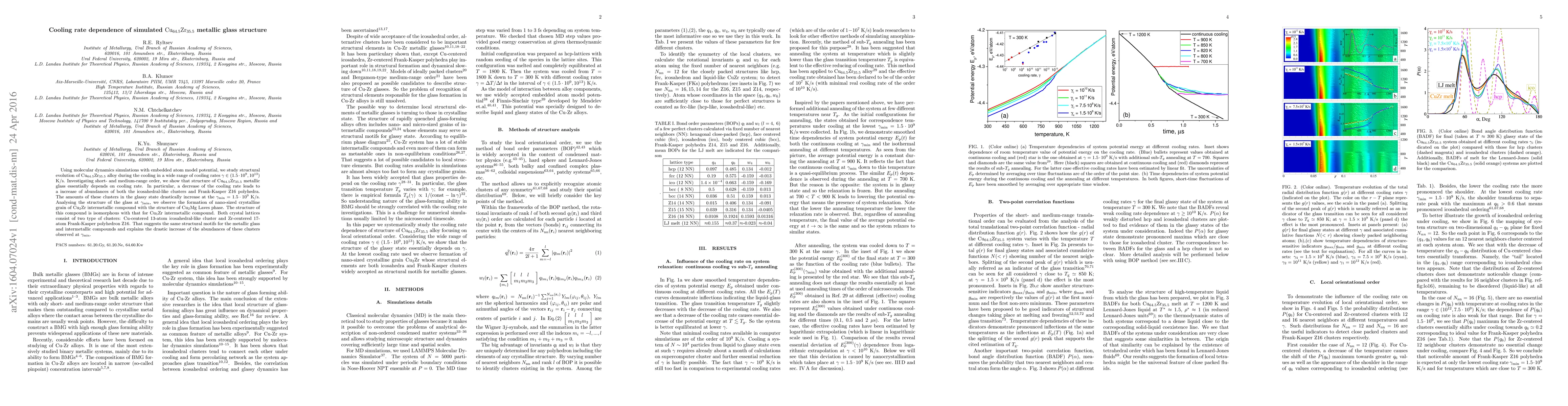 This paper uses molecular dynamics simulations to study how the structure of ${\rm Cu_{64.5}Zr_{35.5}}$ metallic glass evolves with cooling rates ranging from $1.5\cdot 10^{9}$ to $10^{13}$ K/s. It reveals that lower cooling rates significantly increase the abundance of icosahedral-like clusters and Frank-Kasper Z16 polyhedra, with a notable formation of ${\rm Cu_2Zr}$ intermetallic compound at the minimum cooling rate.