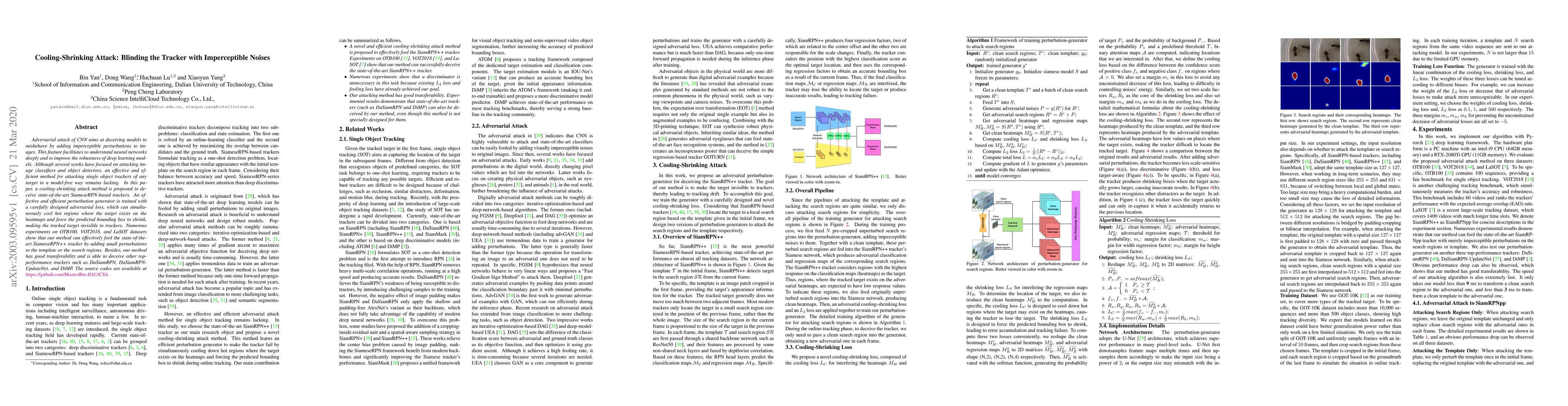 This paper introduces the Cooling-Shrinking Attack (CSA) method to deceive SiameseRPN-based trackers by adding imperceptible noises. CSA simultaneously cools hot regions on heatmaps and shrinks predicted bounding boxes, rendering targets invisible. Experiments on OTB100, VOT2018, and LaSOT datasets show CSA's effectiveness against state-of-the-art trackers like SiameseRPN++, DaSiamRPN, DaSiamRPN-UpdateNet, and DiMP. The method demonstrates good transferability across various trackers.