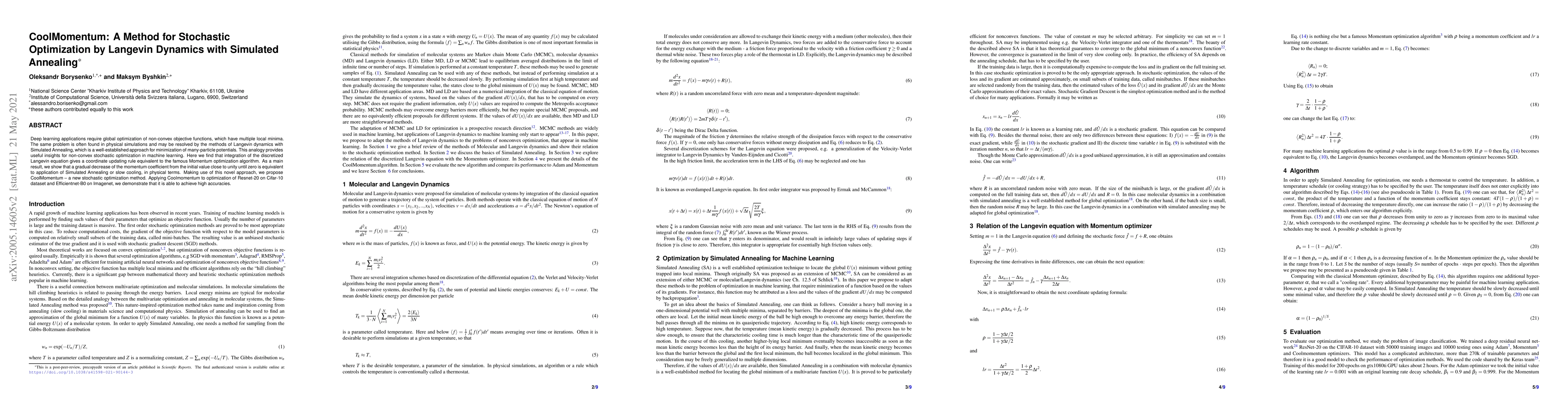 Deep learning applications require global optimization of non-convex objective functions, which have multiple local minima. The same problem is often found in physical simulations and may be resolved by the methods of Langevin dynamics with Simulated Annealing, which is a well-established approach for minimization of many-particle potentials. This analogy provides useful insights for non-convex stochastic optimization in machine learning. Here we find that integration of the discretized Langevin equation gives a coordinate updating rule equivalent to the famous Momentum optimization algorithm. As a main result, we show that a gradual decrease of the momentum coefficient from the initial value close to unity until zero is equivalent to application of Simulated Annealing or slow cooling, in physical terms. Making use of this novel approach, we propose CoolMomentum -- a new stochastic optimization method. Applying Coolmomentum to optimization of Resnet-20 on Cifar-10 dataset and Efficientnet-B0 on Imagenet, we demonstrate that it is able to achieve high accuracies.