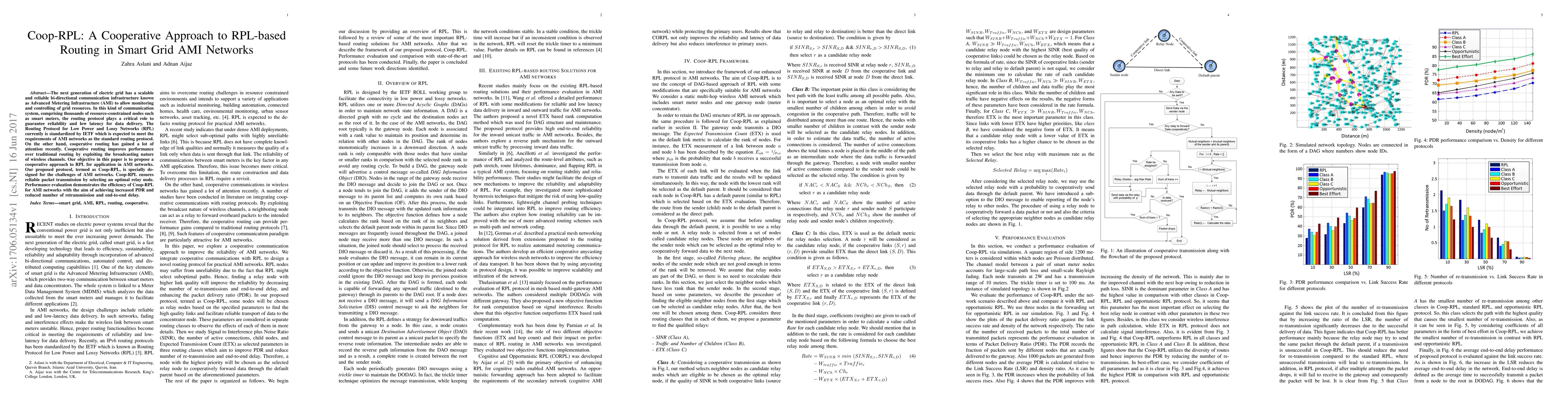 Coop-RPL, a cooperative approach to RPL-based routing in AMI networks, that ensures reliable packet transmission by selecting an optimal relay node using SINR, traffic, number of children, and ETX parameters.