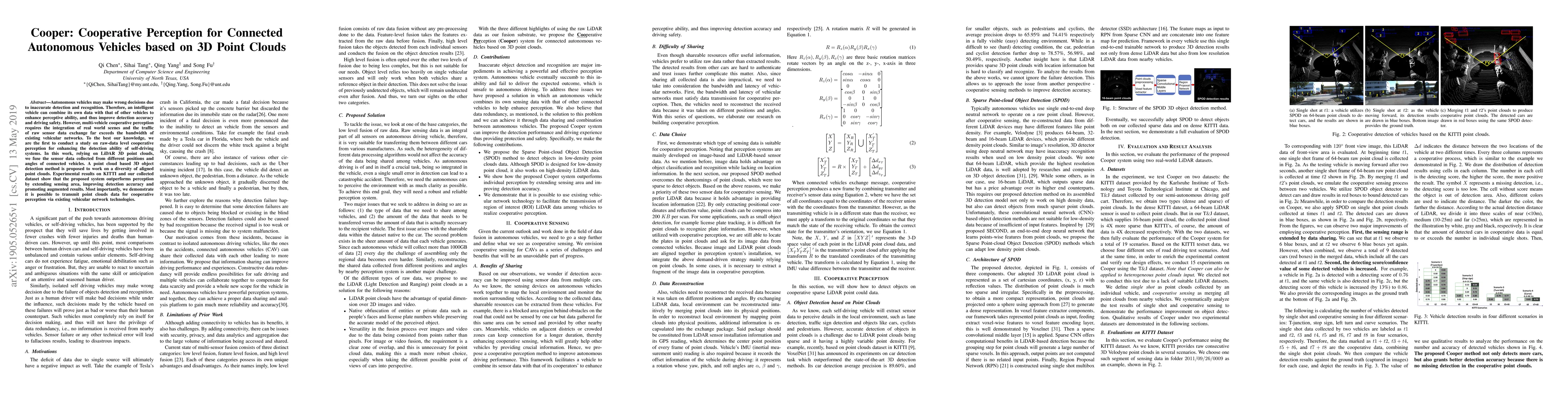 This paper proposes a cooperative perception method for connected autonomous vehicles using LiDAR 3D point clouds to enhance detection accuracy and safety. The system integrates data from multiple vehicles to extend sensing areas, improve detection accuracy, and demonstrate feasible data transmission via existing vehicular networks.