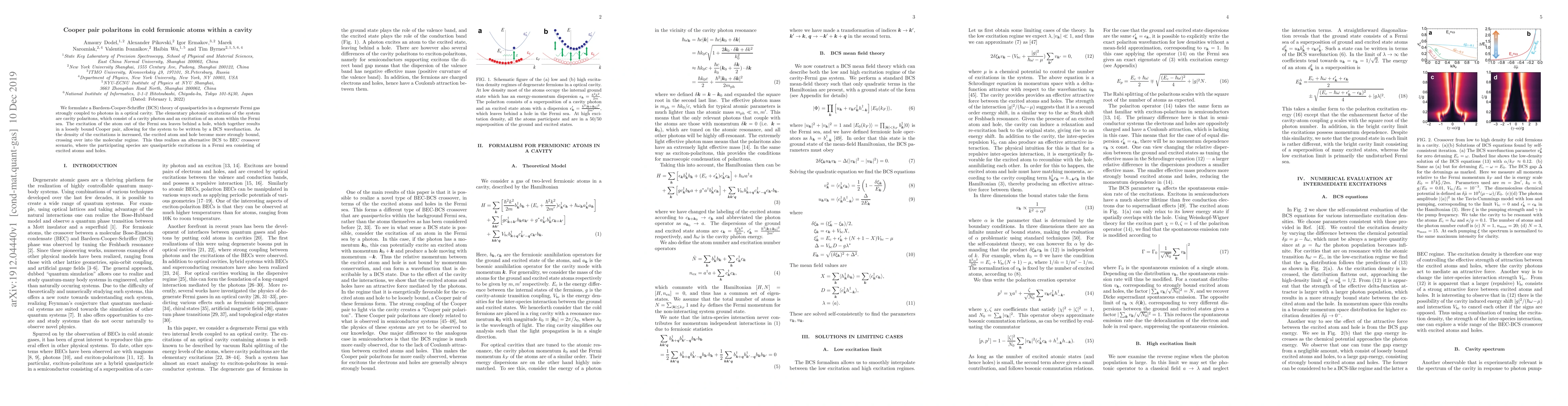 We formulate a Bardeen-Cooper-Schriffer (BCS) theory of quasiparticles in a degenerate Fermi gas strongly coupled to photons in a optical cavity. The elementary photonic excitations of the system are cavity polaritons, which consist of a cavity photon and an excitation of an atom within the Fermi sea. The excitation of the atom out of the Fermi sea leaves behind a hole, which together results in a loosely bound Cooper pair, allowing for the system to be written by a BCS wavefunction. As the density of the excitations is increased, the excited atom and hole become more strongly bound, crossing over into the molecular regime. This thus realizes an alternative BCS to BEC crossover scenario, where the participating species are quasiparticle excitations in a Fermi sea consisting of excited atoms and holes.