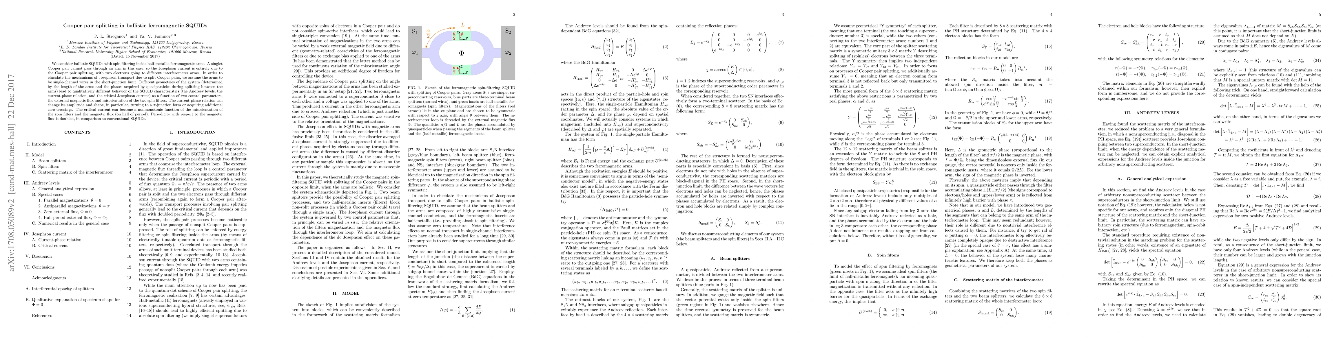 We consider ballistic SQUIDs with spin filtering inside half-metallic ferromagnetic arms. A singlet Cooper pair cannot pass through an arm in this case, so the Josephson current is entirely due to the Cooper pair splitting, with two electrons going to different interferometer arms. In order to elucidate the mechanisms of Josephson transport due to split Cooper pairs, we assume the arms to be single-channel wires in the short-junction limit. Different geometries of the system (determined by the length of the arms and the phases acquired by quasiparticles during splitting between the arms) lead to qualitatively different behavior of the SQUID characteristics (the Andreev levels, the current-phase relation, and the critical Josephson current) as a function of two control parameters, the external magnetic flux and misorientation of the two spin filters. The current-phase relation can change its amplitude and shape, in particular, turning to a pi-junction form or acquiring additional zero crossings. The critical current can become a nonmonotonic function of the misorientation of the spin filters and the magnetic flux (on half of period). Periodicity with respect to the magnetic flux is doubled, in comparison to conventional SQUIDs.
