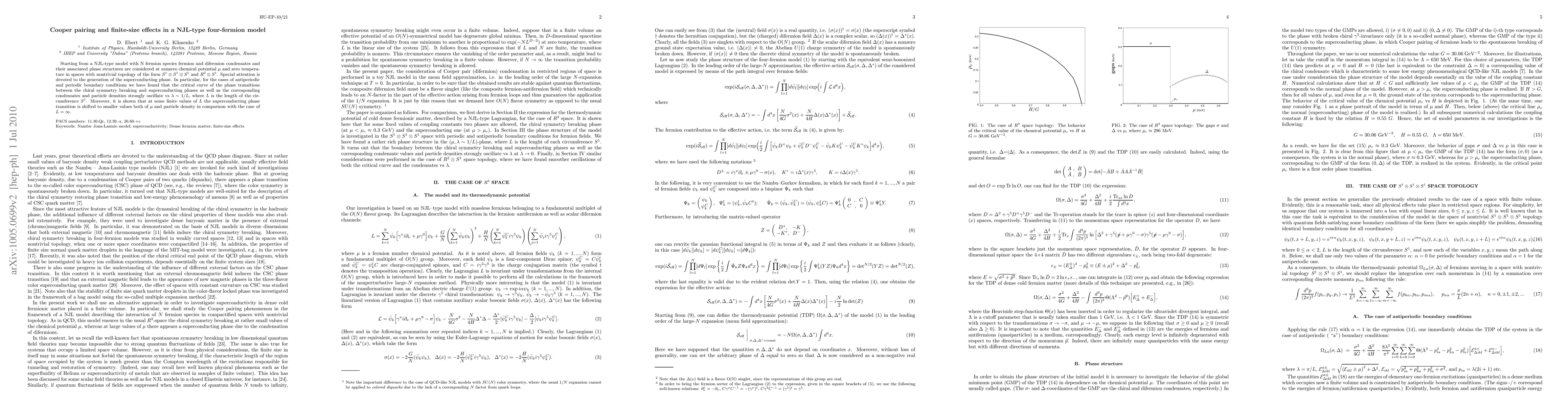 This paper investigates the Cooper pairing and finite-size effects in a NJL-type four-fermion model under nontrivial topologies, finding strong oscillations in the critical curve for phase transitions and shifts in superconducting phase transitions at finite sizes compared to infinite size limits.