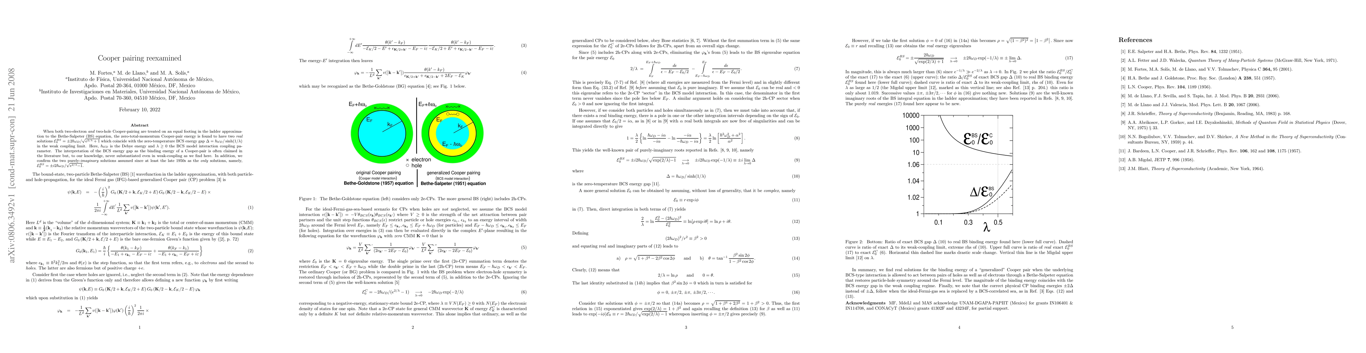 This paper reexamines Cooper pairing in the ladder approximation to the Bethe-Salpeter equation, finding two real solutions for the zero-total-momentum Cooper-pair energy that match the BCS energy gap in weak coupling. It confirms the existence of purely imaginary solutions, substantiating the BCS energy gap as the binding energy of a Cooper pair.