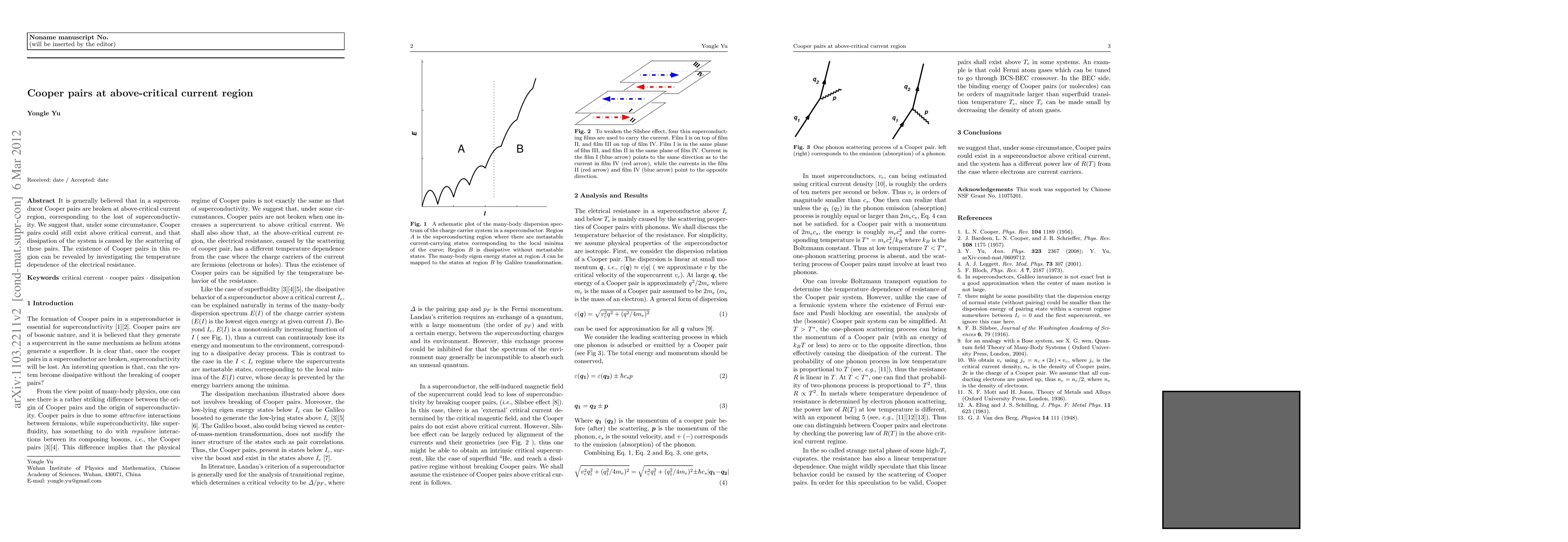 This paper challenges the notion that Cooper pairs are broken above the critical current, proposing instead that they may persist, with dissipation resulting from pair scattering. The study suggests that the temperature dependence of electrical resistance can reveal the presence of Cooper pairs in the above-critical current region.