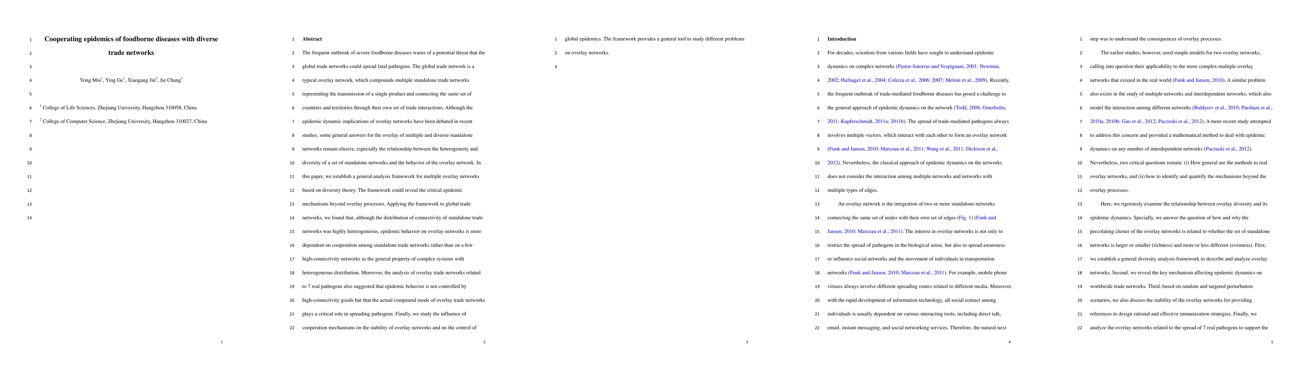 The frequent outbreak of severe foodborne diseases warns of a potential threat that the global trade networks could spread fatal pathogens. The global trade network is a typical overlay network, which compounds multiple standalone trade networks representing the transmission of a single product and connecting the same set of countries and territories through their own set of trade interactions. Although the epidemic dynamic implications of overlay networks have been debated in recent studies, some general answers for the overlay of multiple and diverse standalone networks remain elusive, especially the relationship between the heterogeneity and diversity of a set of standalone networks and the behavior of the overlay network. In this paper, we establish a general analysis framework for multiple overlay networks based on diversity theory. The framework could reveal the critical epidemic mechanisms beyond overlay processes. Applying the framework to global trade networks, we found that, although the distribution of connectivity of standalone trade networks was highly heterogeneous, epidemic behavior on overlay networks is more dependent on cooperation among standalone trade networks rather than on a few high-connectivity networks as the general property of complex systems with heterogeneous distribution. Moreover, the analysis of overlay trade networks related to 7 real pathogens also suggested that epidemic behavior is not controlled by high-connectivity goods but that the actual compound mode of overlay trade networks plays a critical role in spreading pathogens. Finally, we study the influence of cooperation mechanisms on the stability of overlay networks and on the control of global epidemics. The framework provides a general tool to study different problems on overlay networks.