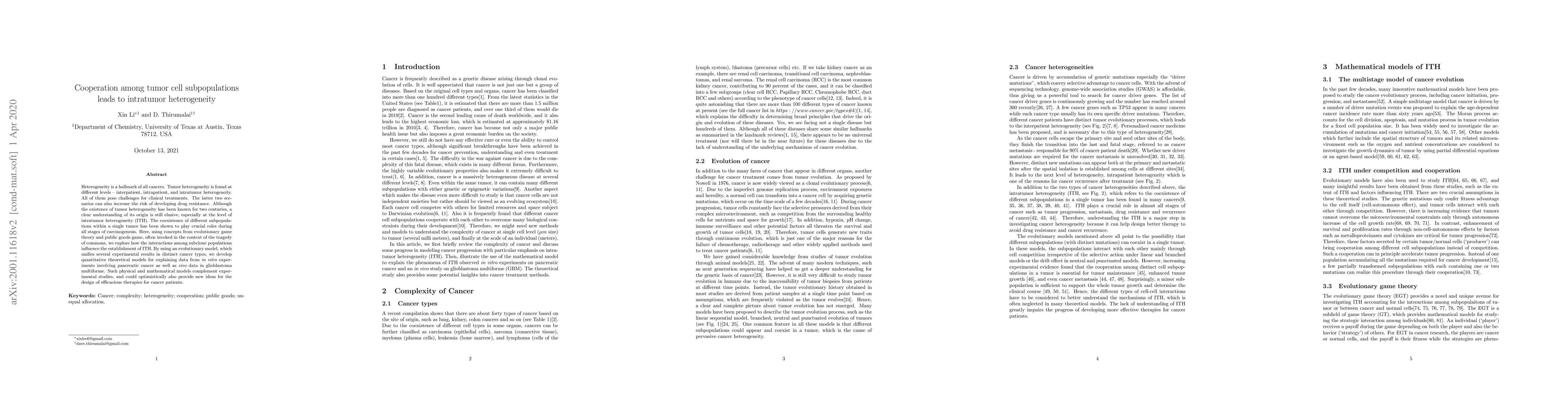 This paper explores the role of cooperation among tumor cell subpopulations in generating intratumor heterogeneity using evolutionary game theory. It develops quantitative models to explain heterogeneity in pancreatic cancer and glioblastoma, aiming to provide insights for more effective cancer therapies.