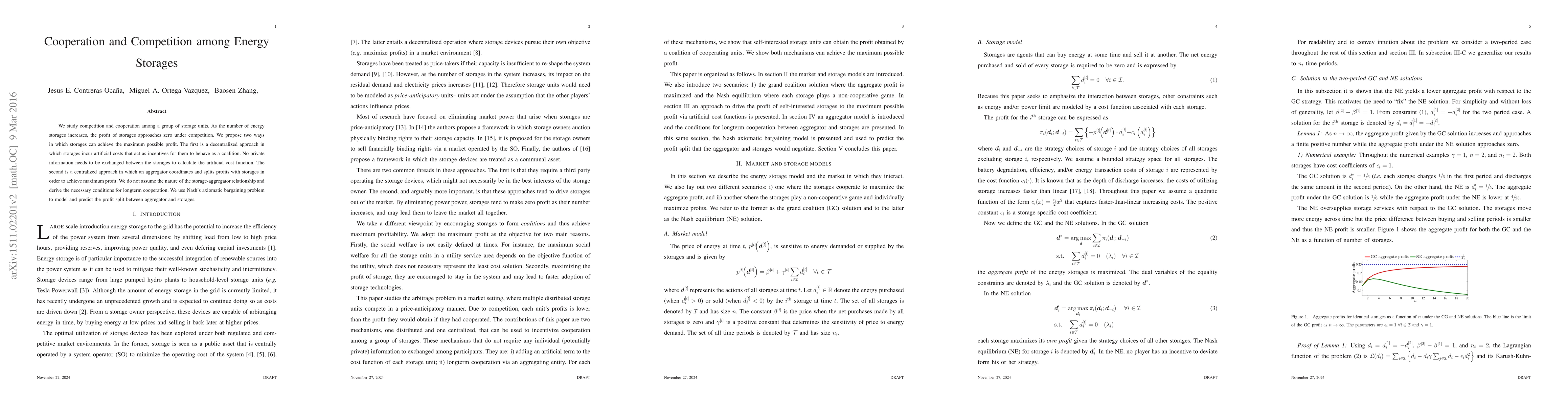 This paper explores the dynamics of competition and cooperation among energy storage units, demonstrating that under Nash competition, profits approach zero as storage numbers increase. It proposes two profit-maximizing strategies: a decentralized method using artificial cost functions and a centralized approach with an aggregator, both leveraging Nash's bargaining problem to optimize profit distribution.
