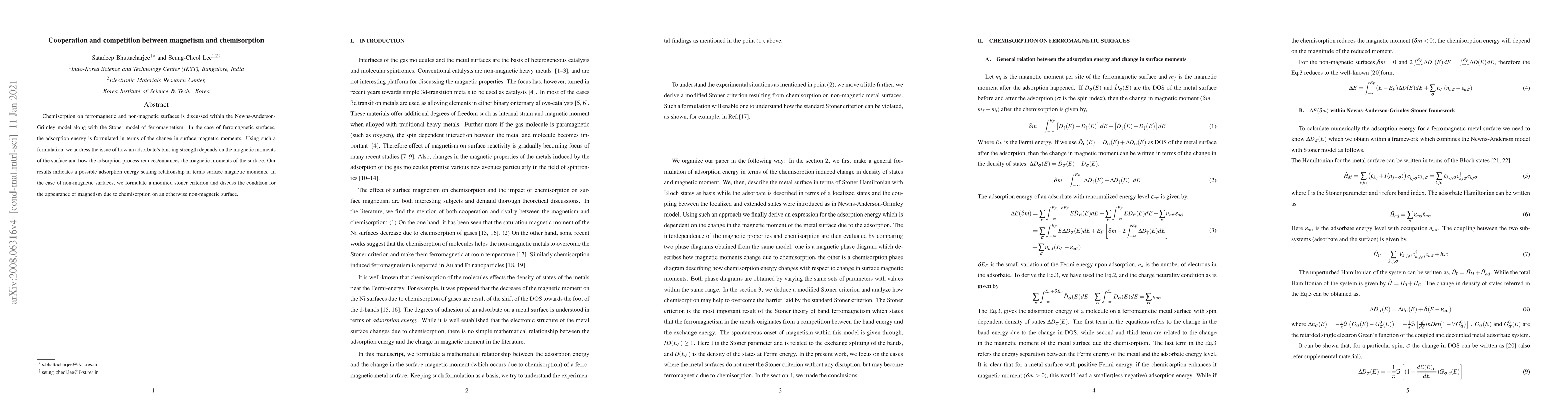 The paper introduces a modified Stoner criterion for non-magnetic surfaces to become ferromagnetic through chemisorption and demonstrates a scaling relationship between adsorption energy and surface magnetic moments for ferromagnetic surfaces.