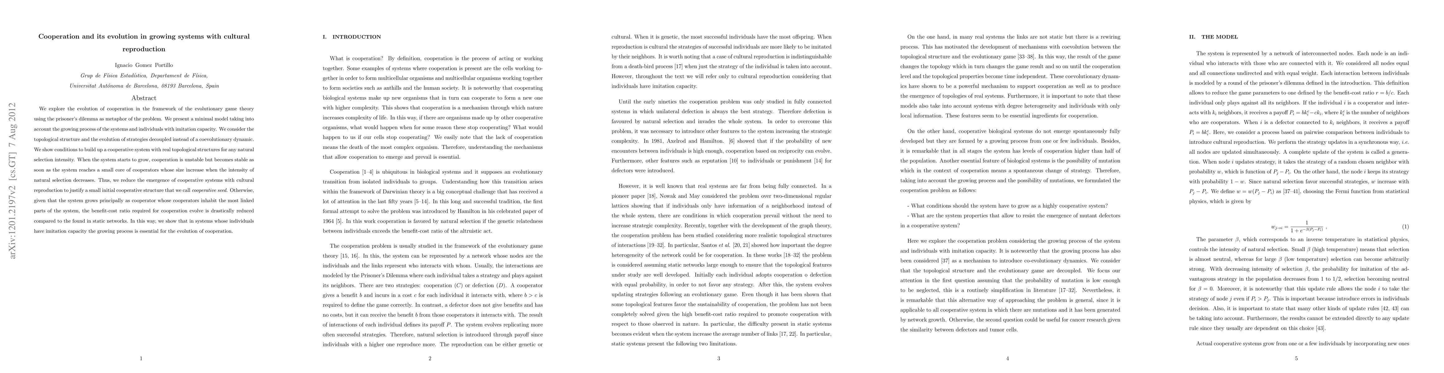 We explore the evolution of cooperation in the framework of the evolutionary game theory using the prisoner's dilemma as metaphor of the problem. We present a minimal model taking into account the growing process of the systems and individuals with imitation capacity. We consider the topological structure and the evolution of strategies decoupled instead of a coevolutionary dynamic. We show conditions to build up a cooperative system with real topological structures for any natural selection intensity. When the system starts to grow, cooperation is unstable but becomes stable as soon as the system reaches a small core of cooperators whose size increase when the intensity of natural selection decreases. Thus, we reduce the emergence of cooperative systems with cultural reproduction to justify a small initial cooperative structure that we call cooperative seed. Otherwise, given that the system grows principally as cooperator whose cooperators inhabit the most linked parts of the system, the benefit-cost ratio required for cooperation evolve is drastically reduced compared to the found in static networks. In this way, we show that in systems whose individuals have imitation capacity the growing process is essential for the evolution of cooperation.