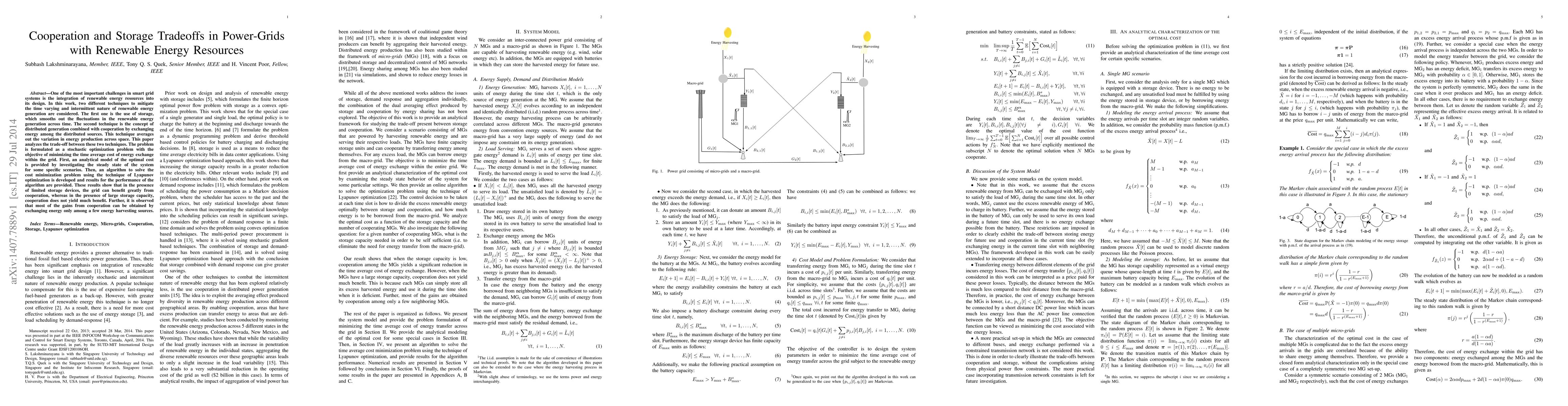 One of the most important challenges in smart grid systems is the integration of renewable energy resources into its design. In this work, two different techniques to mitigate the time varying and intermittent nature of renewable energy generation are considered. The first one is the use of storage, which smooths out the fluctuations in the renewable energy generation across time. The second technique is the concept of distributed generation combined with cooperation by exchanging energy among the distributed sources. This technique averages out the variation in energy production across space. This paper analyzes the trade-off between these two techniques. The problem is formulated as a stochastic optimization problem with the objective of minimizing the time average cost of energy exchange within the grid. First, an analytical model of the optimal cost is provided by investigating the steady state of the system for some specific scenarios. Then, an algorithm to solve the cost minimization problem using the technique of Lyapunov optimization is developed and results for the performance of the algorithm are provided. These results show that in the presence of limited storage devices, the grid can benefit greatly from cooperation, whereas in the presence of large storage capacity, cooperation does not yield much benefit. Further, it is observed that most of the gains from cooperation can be obtained by exchanging energy only among a few energy harvesting sources.
