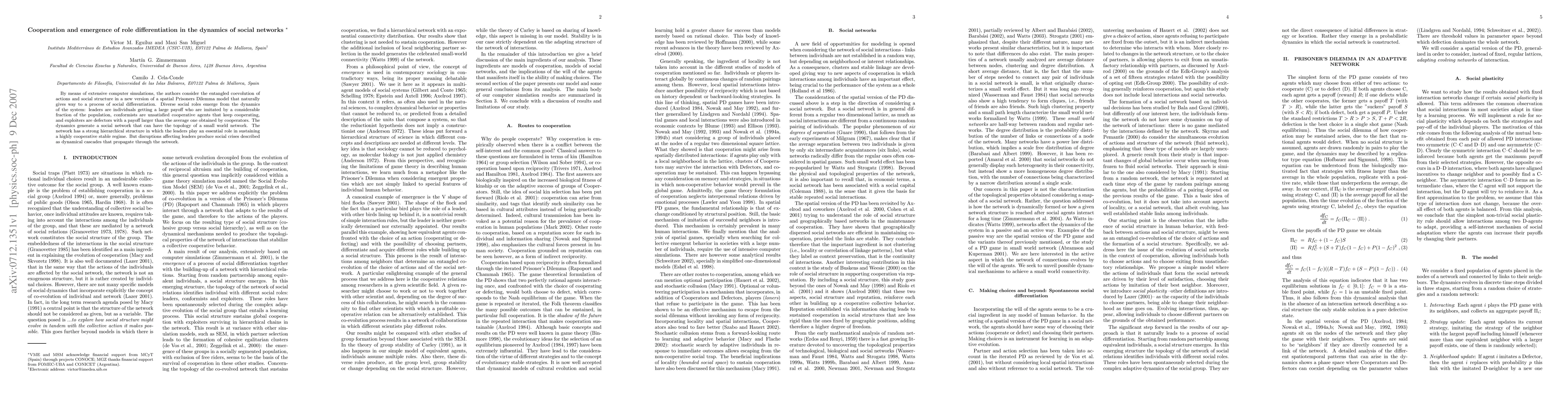 By means of extensive computer simulations, the authors consider the entangled coevolution of actions and social structure in a new version of a spatial Prisoner's Dilemma model that naturally gives way to a process of social differentiation. Diverse social roles emerge from the dynamics of the system: leaders are individuals getting a large payoff who are imitated by a considerable fraction of the population, conformists are unsatisfied cooperative agents that keep cooperating, and exploiters are defectors with a payoff larger than the average one obtained by cooperators. The dynamics generate a social network that can have the topology of a small world network. The network has a strong hierarchical structure in which the leaders play an essential role in sustaining a highly cooperative stable regime. But disruptions affecting leaders produce social crises described as dynamical cascades that propagate through the network.