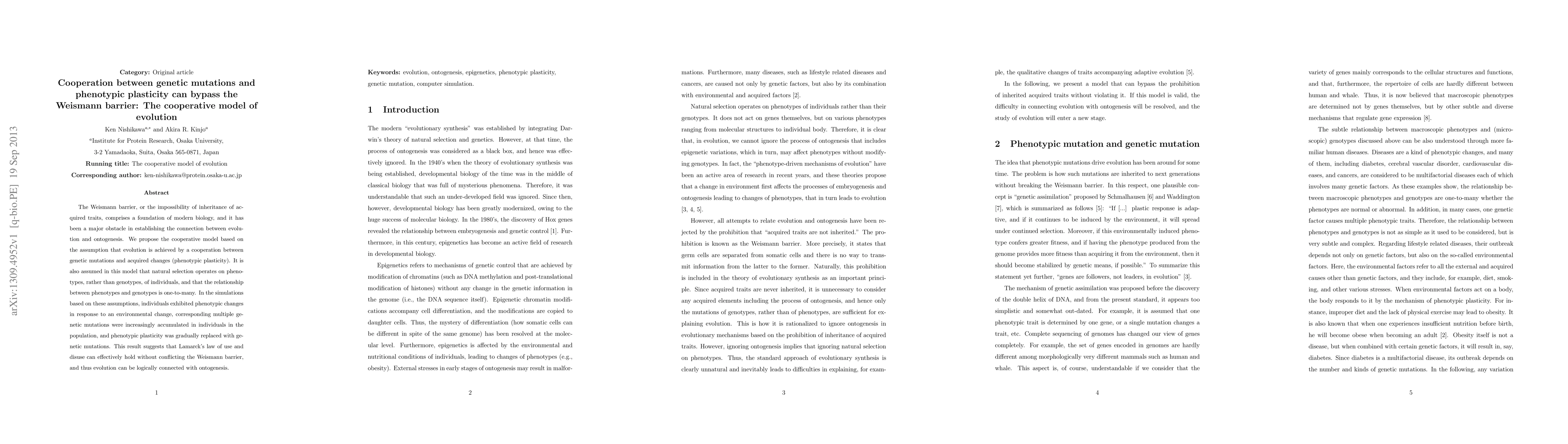 This paper proposes a cooperative model of evolution where genetic mutations and phenotypic plasticity work together to bypass the Weismann barrier, allowing acquired traits to be inherited. This model suggests that natural selection acts on phenotypes, and phenotypic plasticity can gradually be replaced by genetic mutations, thus linking evolution with individual development.