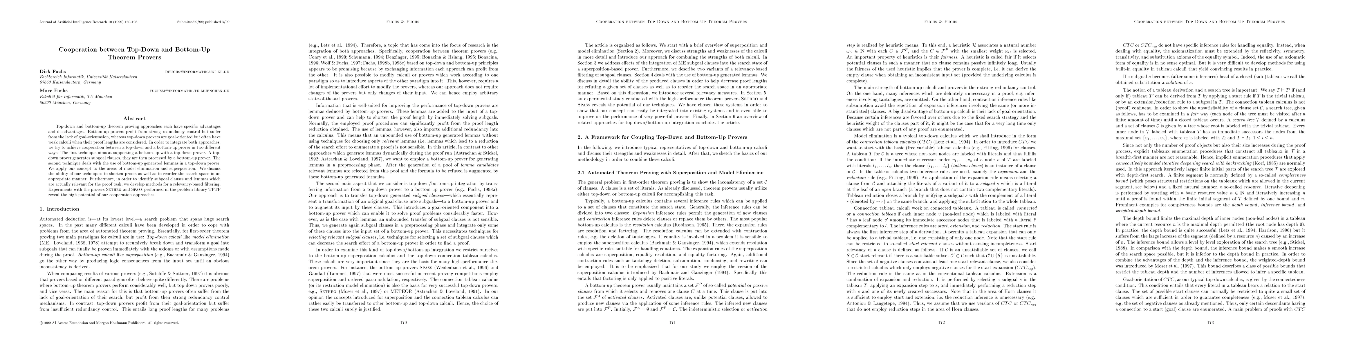 This paper explores the integration of top-down and bottom-up theorem provers to leverage their respective strengths. It proposes two cooperation techniques: one where a top-down prover generates subgoals for a bottom-up prover, and another where bottom-up generated lemmas assist a top-down prover. Experiments show significant proof shortening and improved search space ordering.