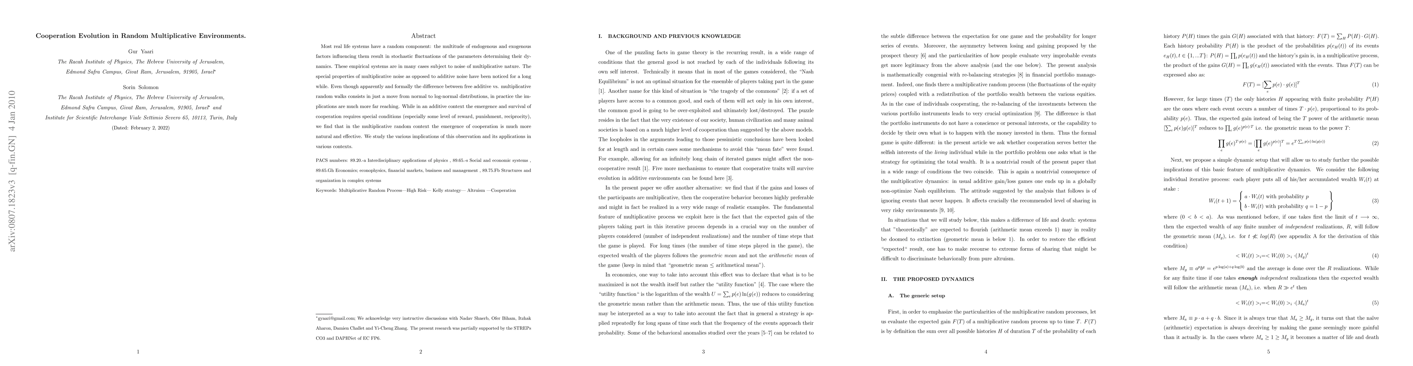 Most real life systems have a random component: the multitude of endogenous and exogenous factors influencing them result in stochastic fluctuations of the parameters determining their dynamics. These empirical systems are in many cases subject to noise of multiplicative nature. The special properties of multiplicative noise as opposed to additive noise have been noticed for a long while. Even though apparently and formally the difference between free additive vs. multiplicative random walks consists in just a move from normal to log-normal distributions, in practice the implications are much more far reaching. While in an additive context the emergence and survival of cooperation requires special conditions (especially some level of reward, punishment, reciprocity), we find that in the multiplicative random context the emergence of cooperation is much more natural and effective. We study the various implications of this observation and its applications in various contexts.