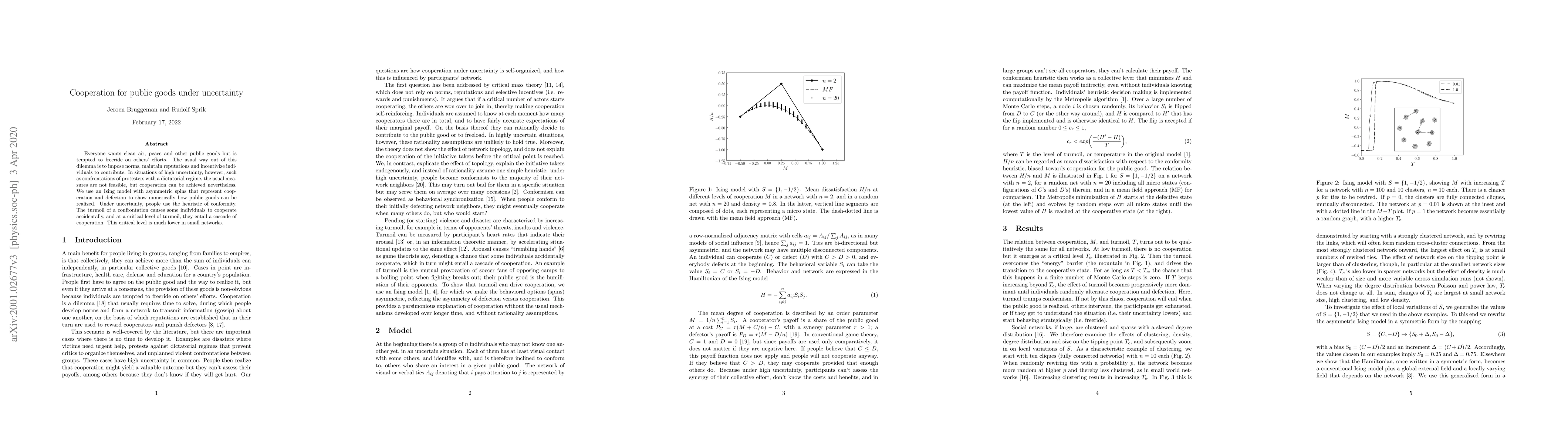 Everyone wants clean air, peace and other public goods but is tempted to freeride on others' efforts. The usual way out of this dilemma is to impose norms, maintain reputations and incentivize individuals to contribute. In situations of high uncertainty, however, such as confrontations of protesters with a dictatorial regime, the usual measures are not feasible, but cooperation can be achieved nevertheless. We use an Ising model with asymmetric spins that represent cooperation and defection to show numerically how public goods can be realized. Under uncertainty, people use the heuristic of conformity. The turmoil of a confrontation causes some individuals to cooperate accidentally, and at a critical level of turmoil, they entail a cascade of cooperation. This critical level is much lower in small networks.
