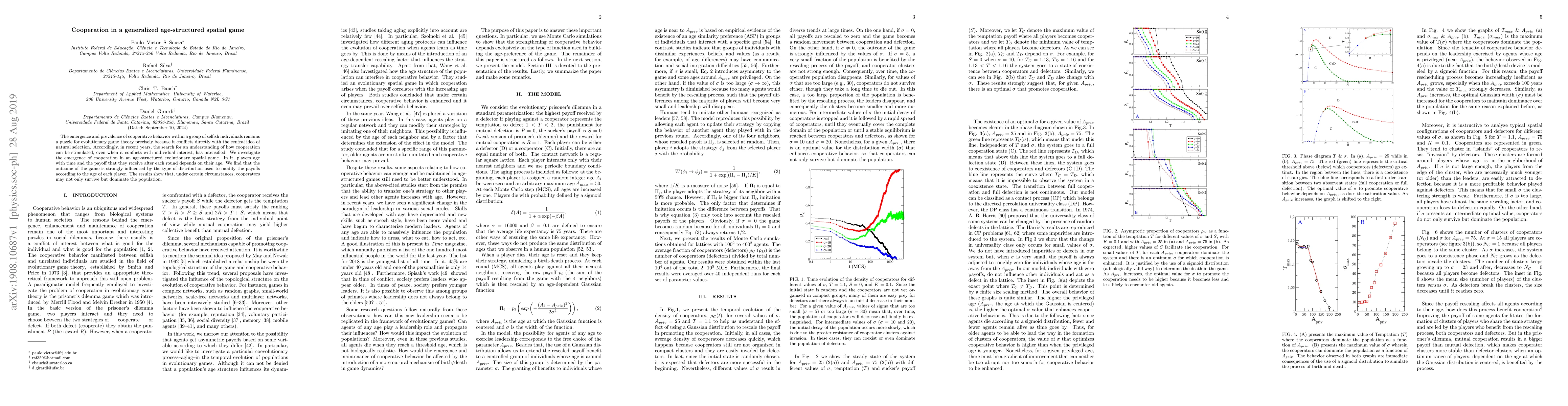 The emergence and prevalence of cooperative behavior within a group of selfish individuals remains a puzzle for \text{evolutionary game theory} precisely because it conflicts directly with the central idea of natural selection. Accordingly, in recent years, the search for an understanding of how cooperation can be stimulated, even when it conflicts with individual interest, has intensified. We investigate the emergence of cooperation in an age-structured evolutionary spatial game. In it, players age with time and the payoff that they receive after each round \text{depends on} their age. \text{We find that t}he outcome of the game is strongly influenced by the type of distribution used to modify the payoffs according to the age of each player. The results show that, under certain circumstances, cooperators may not only survive but dominate the population.