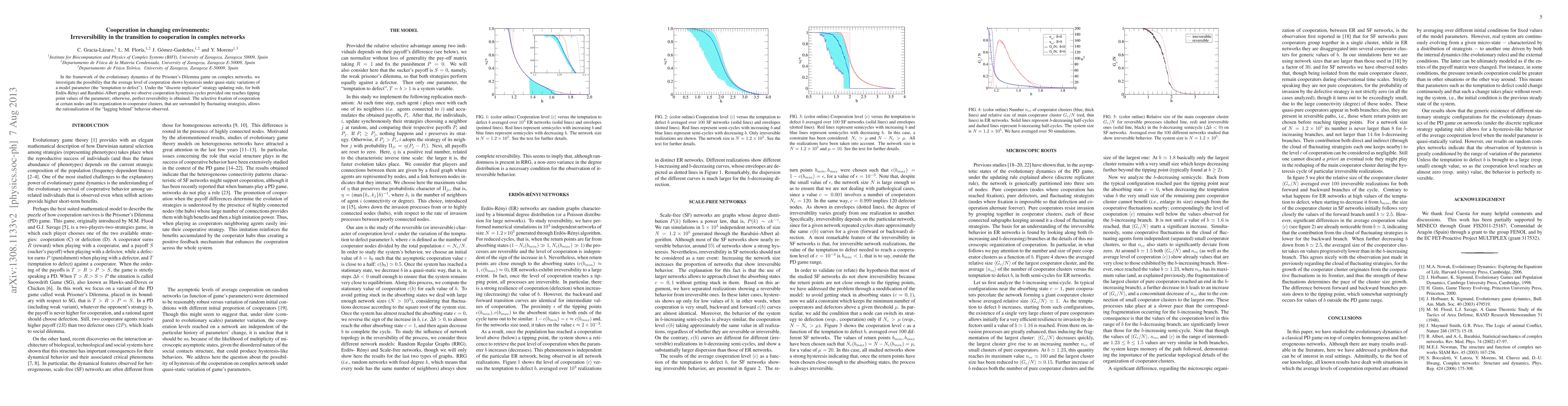 This study explores cooperation dynamics in the Prisoner's Dilemma on complex networks, finding that cooperation levels exhibit hysteresis under parameter changes, leading to cooperation clusters and "lagging behind" behavior, unless tipping points are reached, in which case reversibility is observed.