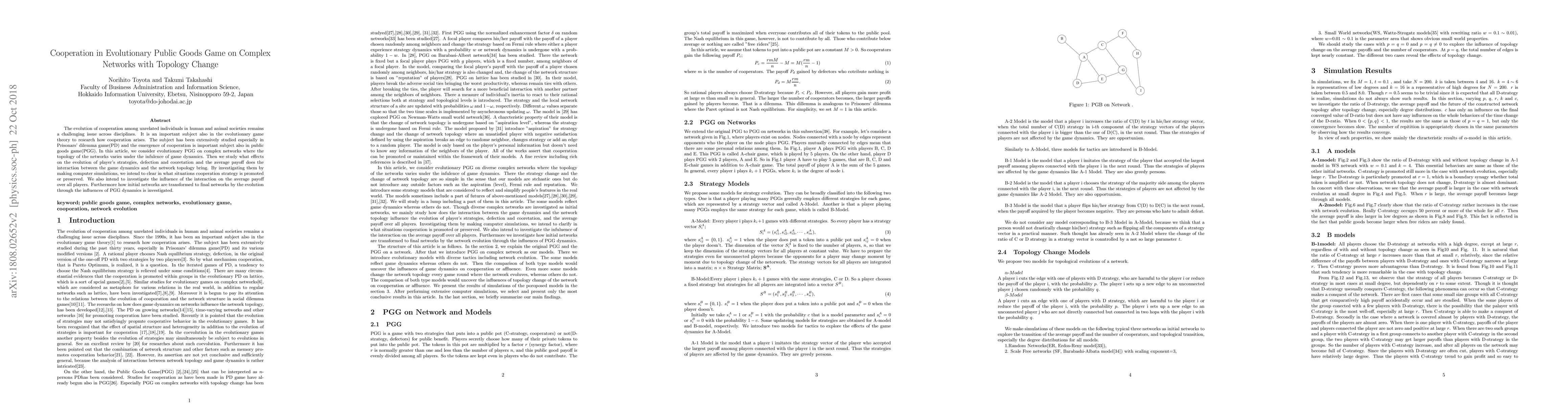 The evolution of cooperation among unrelated individuals in human and animal societies remains a challenging issue across disciplines. It is an important subject also in the evolutionary game theory to research how cooperation arises. The subject has been extensively studied especially in Prisonars' dilemma game(PD) and the emergence of cooperation is important subject also in public goods game(PGG). In this article, we consider evolutionary PGG on complex networks where the topology of the networks varies under the infulence of game dynamics. Then we study what effects on the evolution of player's strategies, defection and cooretation and the average payoff does the interaction between the game dynamics and the network topology bring. By investigating them by making computer simulations, we intend to clear in what situations cooperation strategy is promoted or preserved. We also intend to investigate the infuluence of the interaction on the average payoff over all players. Furthermore how initial networks are transformed to final networks by the evolution through the influences of PGG dynamics is invistigated.