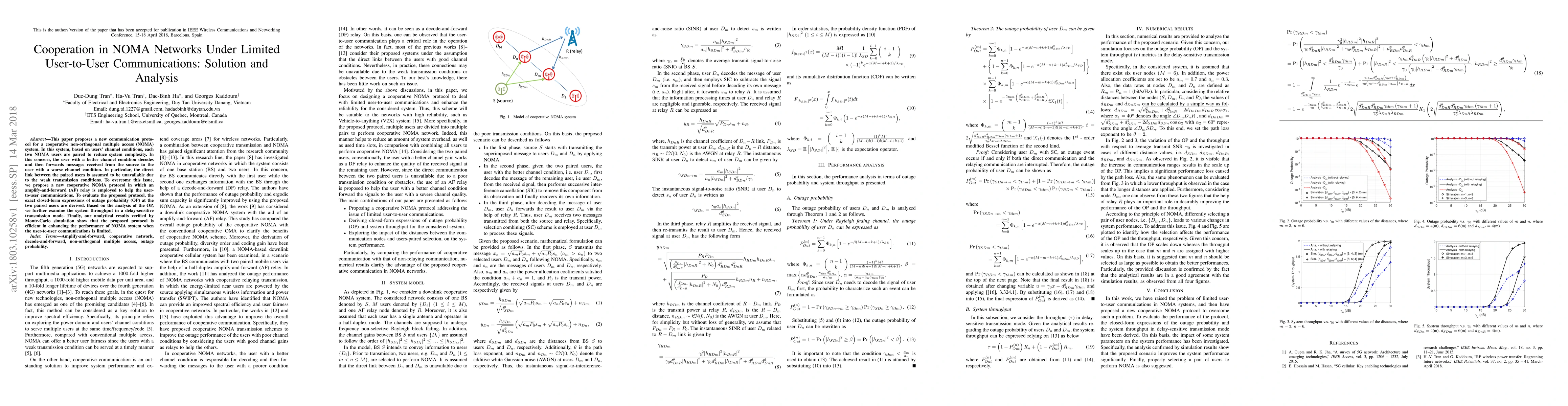 This paper proposes a new communication protocol for a cooperative non-orthogonal multiple access (NOMA) system. In this system, based on users' channel conditions, each two NOMA users are paired to reduce system complexity. In this concern, the user with a better channel condition decodes and then forwards messages received from the source to the user with a worse channel condition. In particular, the direct link between the paired users is assumed to be unavailable due to the weak transmission conditions. To overcome this issue, we propose a new cooperative NOMA protocol in which an amplify-and-forward (AF) relay is employed to help the user-to-user communications. To evaluate the proposed protocol, the exact closed-form expressions of outage probability (OP) at the two paired users are derived. Based on the analysis of the OP, we further examine the system throughput in a delay-sensitive transmission mode. Finally, our analytical results verified by Monte-Carlo simulation show that the proposed protocol is efficient in enhancing the performance of NOMA system when the user-to-user communications is limited.