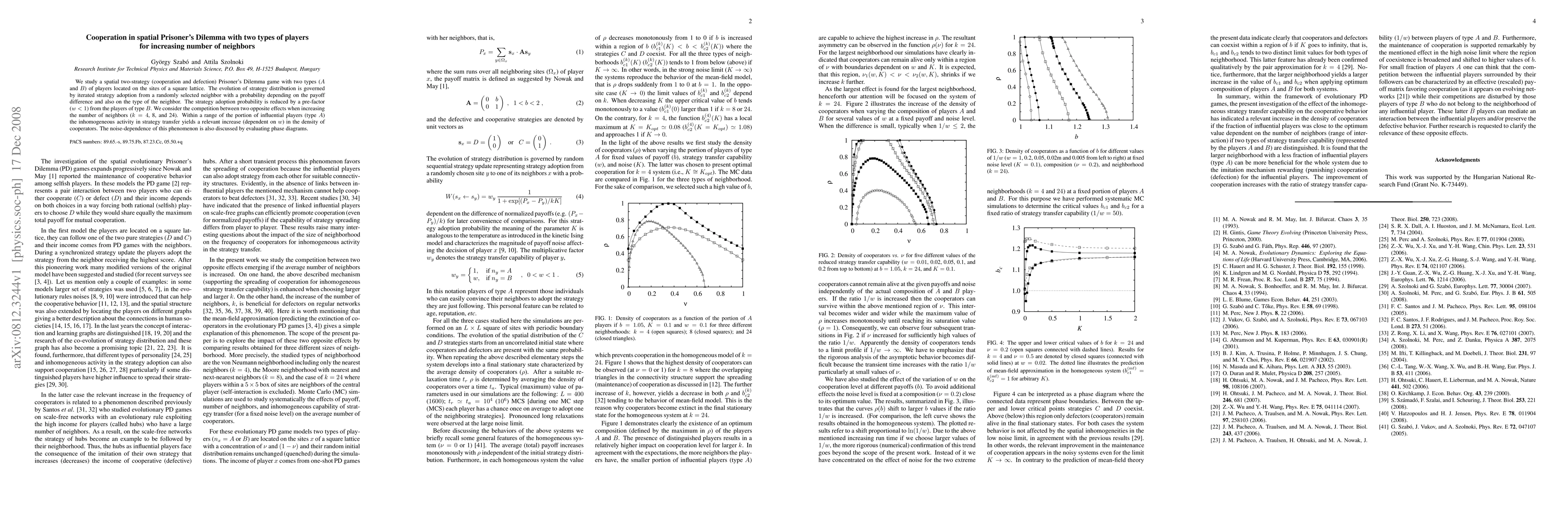 We study a spatial two-strategy (cooperation and defection) Prisoner's Dilemma game with two types ($A$ and $B$) of players located on the sites of a square lattice. The evolution of strategy distribution is governed by iterated strategy adoption from a randomly selected neighbor with a probability depending on the payoff difference and also on the type of the neighbor. The strategy adoption probability is reduced by a pre-factor ($w < 1$) from the players of type $B$. We consider the competition between two opposite effects when increasing the number of neighbors ($k=4$, 8, and 24). Within a range of the portion of influential players (type $A$) the inhomogeneous activity in strategy transfer yields a relevant increase (dependent on $w$) in the density of cooperators. The noise-dependence of this phenomenon is also discussed by evaluating phase diagrams.