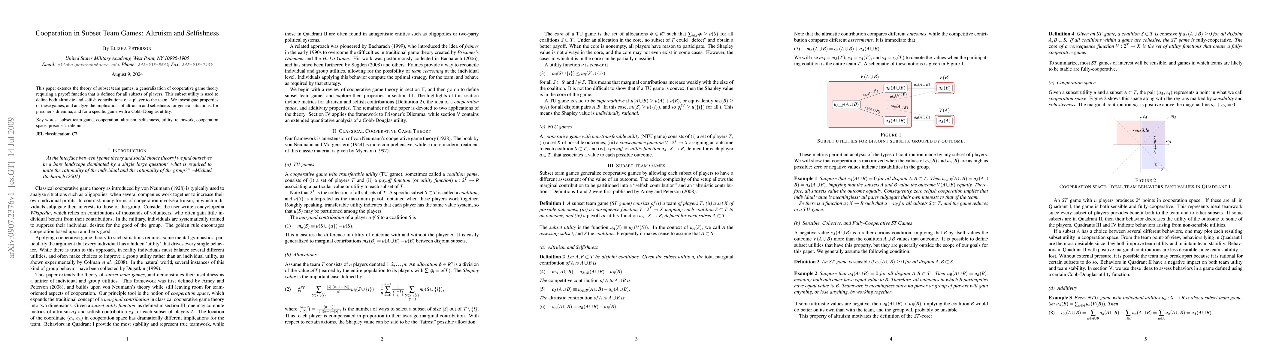 This paper explores subset team games, analyzing altruistic and selfish contributions within these cooperative frameworks, and examines their implications in general situations, the prisoner's dilemma, and a Cobb-Douglas utility game.