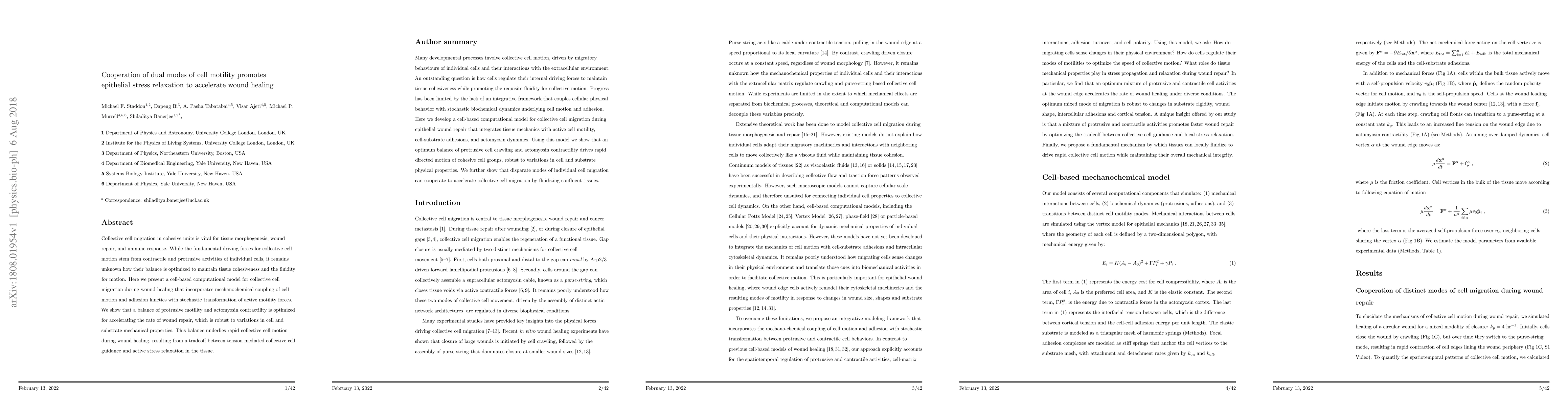 This paper presents a computational model demonstrating that a balanced cooperation between protrusive motility and actomyosin contractility optimizes collective cell migration, thereby accelerating wound healing by promoting tissue stress relaxation and maintaining tissue cohesiveness. The model highlights the importance of this balance in achieving rapid collective cell motion during wound repair.