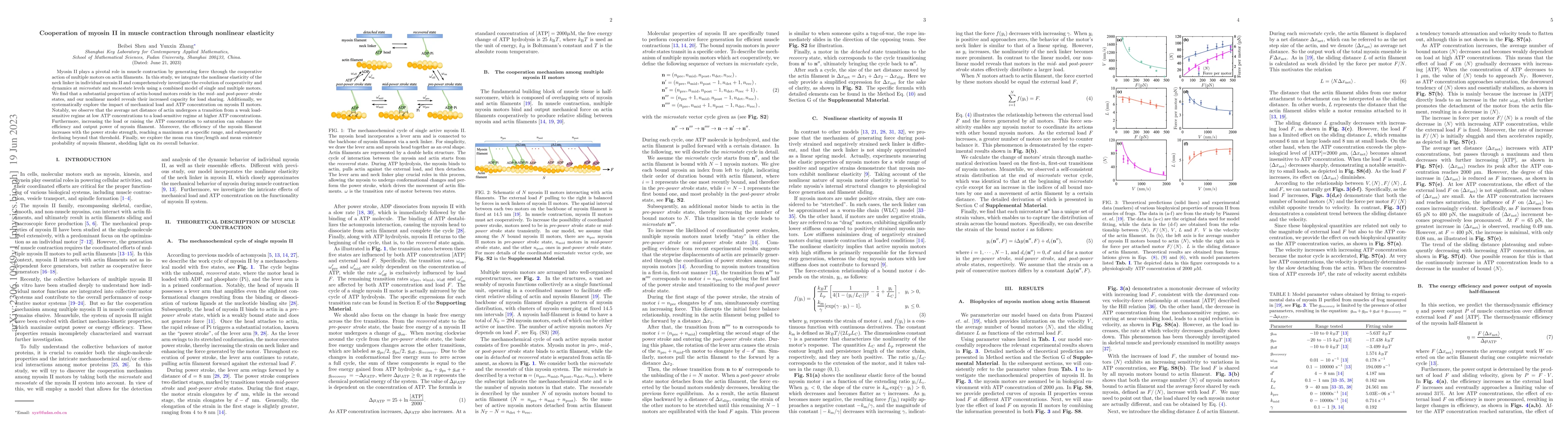 This study investigates how the nonlinear elasticity of myosin II's neck linker influences muscle contraction through cooperative motor action on actin filaments. It reveals that increased load and ATP concentration enhance myosin efficiency and output power, with optimal performance at a specific power stroke strength.