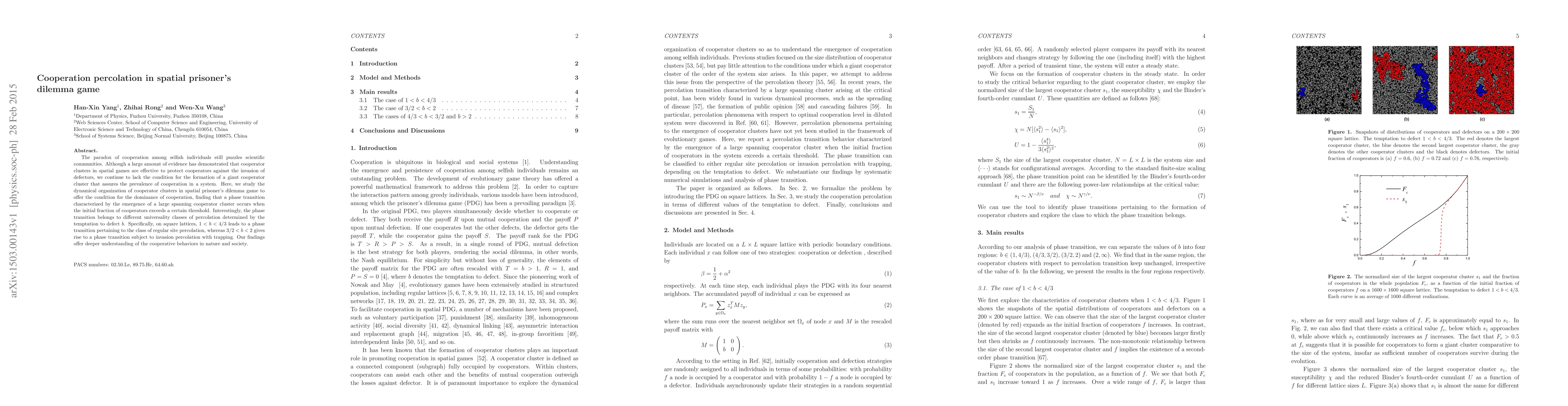 This paper explores the conditions for the emergence of large cooperative clusters in spatial prisoner's dilemma games, identifying a phase transition where cooperation dominates when the initial cooperator fraction exceeds a threshold. The study reveals different universality classes of percolation depending on the temptation to defect, providing insights into cooperative behaviors in natural and social systems.