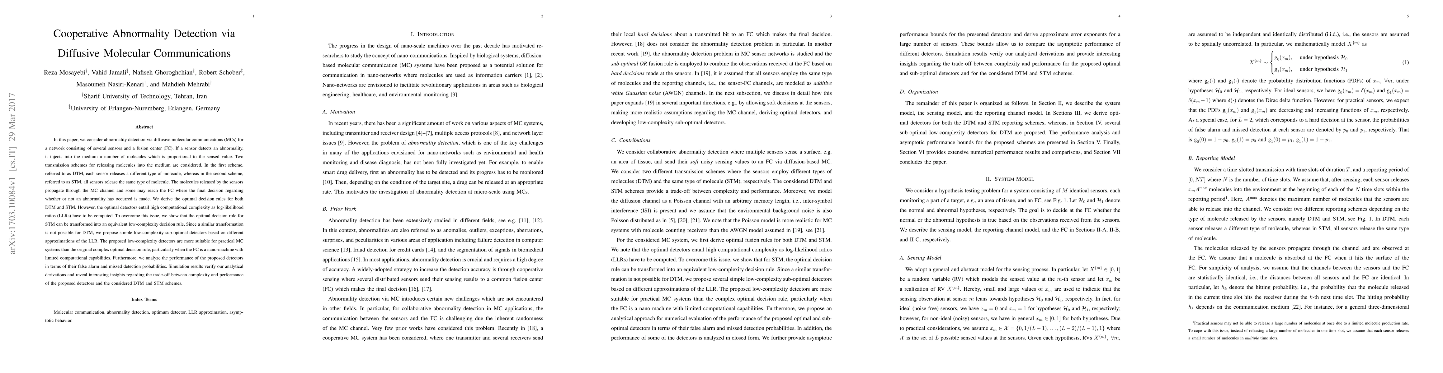 This paper explores abnormality detection in sensor networks using diffusive molecular communications, proposing two transmission schemes: DTM and STM. It derives optimal decision rules but addresses high computational complexity by introducing low-complexity sub-optimal detectors for practical implementation, especially in nano-machines. The performance of these detectors is analyzed and verified through simulations.