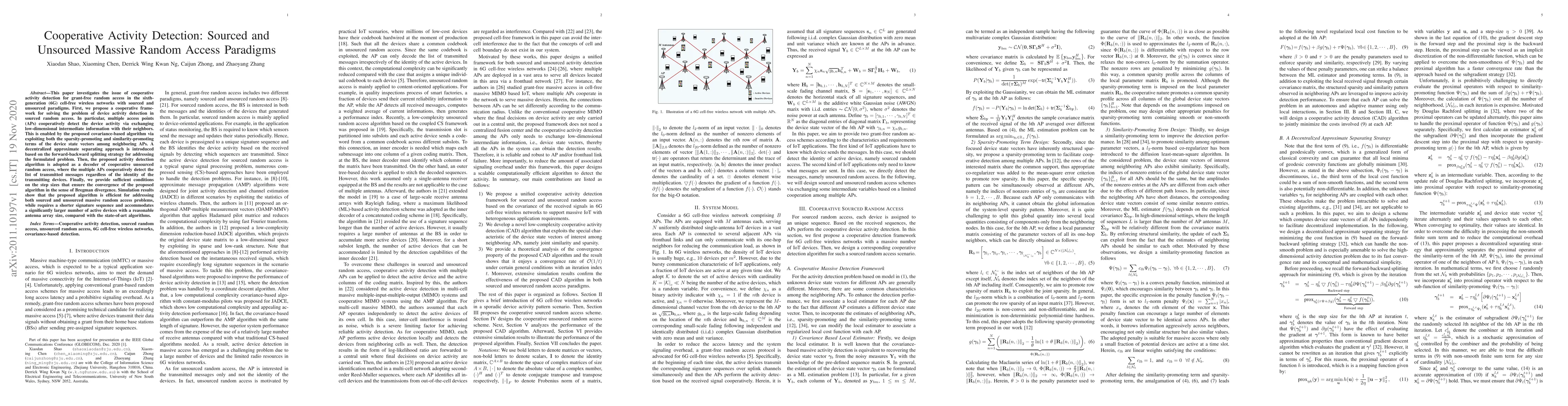 This paper investigates the issue of cooperative activity detection for grant-free random access in the sixth-generation (6G) cell-free wireless networks with sourced and unsourced paradigms. First, we propose a cooperative framework for solving the problem of device activity detection in sourced random access. In particular, multiple access points (APs) cooperatively detect the device activity via exchanging low-dimensional intermediate information with their neighbors. This is enabled by the proposed covariance-based algorithm via exploiting both the sparsity-promoting and similarity-promoting terms of the device state vectors among neighboring APs. A decentralized approximate separating approach is introduced based on the forward-backward splitting strategy for addressing the formulated problem. Then, the proposed activity detection algorithm is adopted as a decoder of cooperative unsourced random access, where the multiple APs cooperatively detect the list of transmitted messages regardless of the identity of the transmitting devices. Finally, we provide sufficient conditions on the step sizes that ensure the convergence of the proposed algorithm in the sense of Bregman divergence. Simulation results show that the proposed algorithm is efficient for addressing both sourced and unsourced massive random access problems, while requires a shorter signature sequence and accommodates a significantly larger number of active devices with a reasonable antenna array size, compared with the state-of-art algorithms.