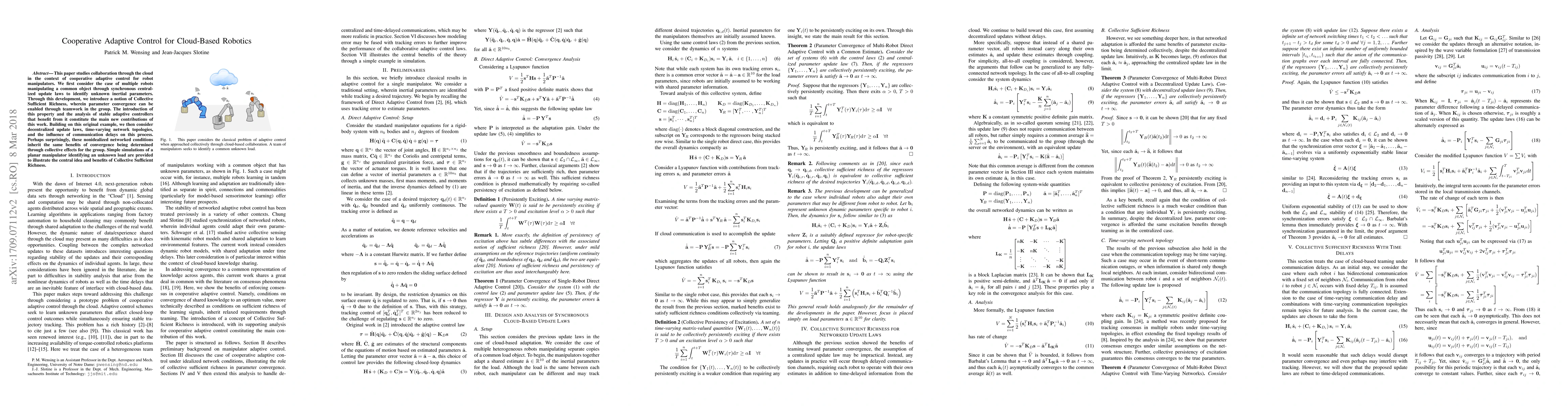 This paper explores how robots can collaboratively learn and adapt using cloud-based cooperative control, introducing the concept of 'Collective Sufficient Richness' for parameter convergence. It also examines decentralized updates, changing network connections, and communication delays, demonstrating that these conditions still allow for group-based convergence benefits through simple planar manipulator simulations.
